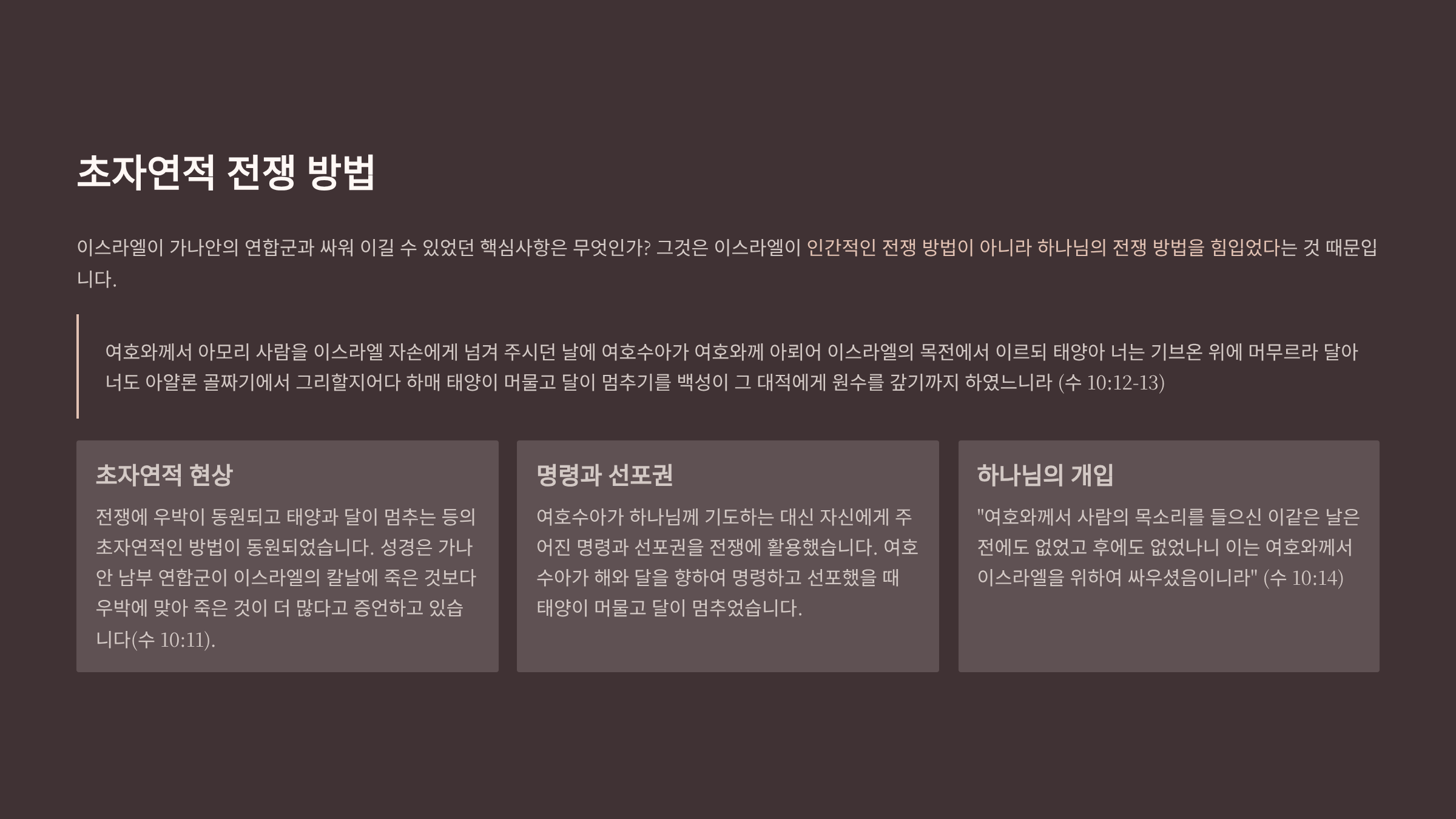 이스라엘이 가나안의 연합군과 싸워 이길 수 있었던 핵심사항은 무엇인가? 그것은 이스라엘이 인간적인 전쟁 방법이 아니라 하나님의 전쟁 방법을 힘입었다는 것 때문이다. 그것은 바로 전쟁에 우박이 동원되고 태양과 달이이 멈추는 등의 초자연적인 방법이 동원된 것이다.  성경은 가나안 남부 연합군이 이스라엘의 칼날에 죽은 것보다 우박에 맞아 죽은 것이 더 많다고 증언하고 있다(수 10:11). 그리고 이어서 여호수아가 하나님께 기도하는 대신 자신에게 주어진 명령과 선포권을 전쟁에 활용한 것이다(수 10:12-14). 그때 여호수아가 이번 전쟁의 승리를 위해 해와 달을 향하여 이렇게 명령하고 선포했음을 기억해야 한다.