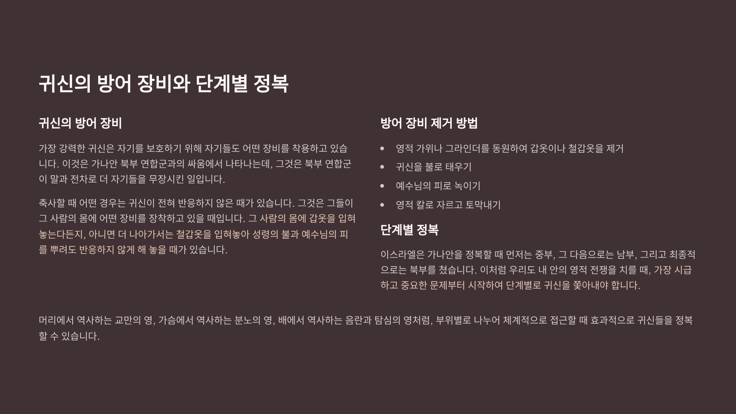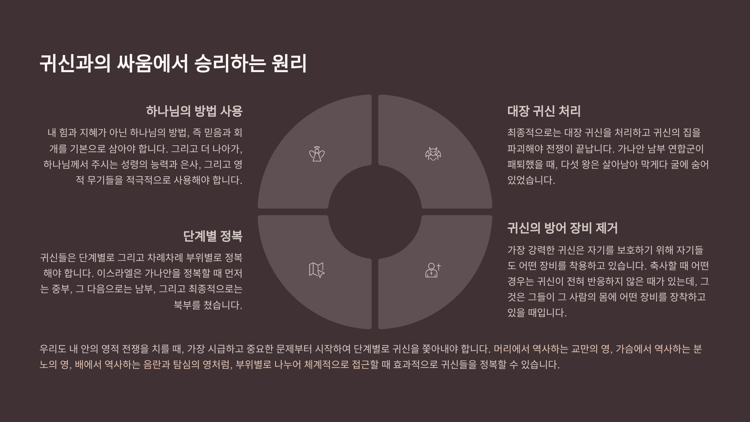 넷째, 귀신들은 단계별로 그리고 차례차례 부이별로 정복해야 한다는 것이다. 이스라엘은 가나안을 정복할 때에는 먼저는 중부, 그 다음으로는 남부, 그리고 최종적으로는 북부를 쳤다. 그래서 차근차근 간아안 땅을 정복해 나갔다. 이처럼 우리도 내 안의 영적 전쟁을 치를 때, 가장 시급하고 중요한 문제부터 시작하여 단계별로 귀신을 쫓아내야 한다. 머리에서 역사하는 교만의 영, 가슴에서 역사하는 분노의 영, 배에서 역사하는 음란과 탐심의 영처럼, 부위별로 나누어 체계적으로 접근할 때 효과적으로 귀신들을 정복할 수 있기 때문이다. 그리고 한 명의 귀신을 쫓아내었다는 것에 만족하지 말고, 그 귀신이 살고 있는 성, 곧 ‘귀신의 집’ 전체를 파괴하고 정복해야 한다. 그러면 그때에 비로소 우리도 진정한 진정한 승리를 얻게 되는 것이다.