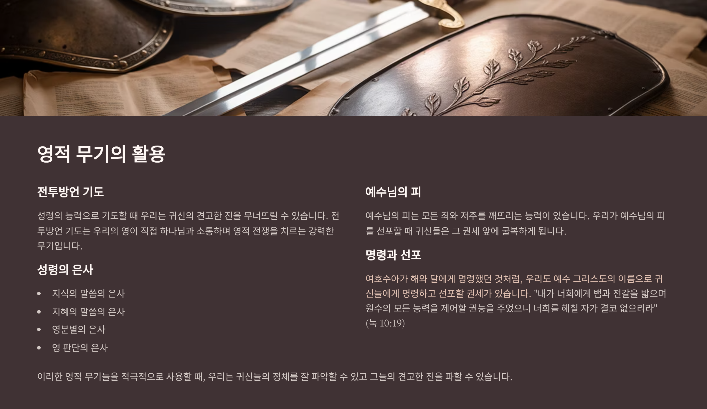 첫째, 내 힘과 지혜가 아닌 하나님의 방법, 즉 믿음과 회개를 기본으로 삼아야 한다는 것이다. 그리고 더 나아가, 하나님께서 주시는 성령의 능력과 은사, 그리고 영적 무기들을 적극적으로 사용해야 한다는 것이다. 전투방언 기도와 더불어 지식의 말씀의 은사, 지혜의 말씀의 은사, 영분별의 은사, 영 판단의 은사 등과 예수님의 피와 성령의 여러가지 무기들을 받아서 사용하는 것이다. 그럴수록 우리들도 귀신들의 정체를 잘 파악할 수 있고 그들의 견고한 진을 파할 수 있는 것이다.
