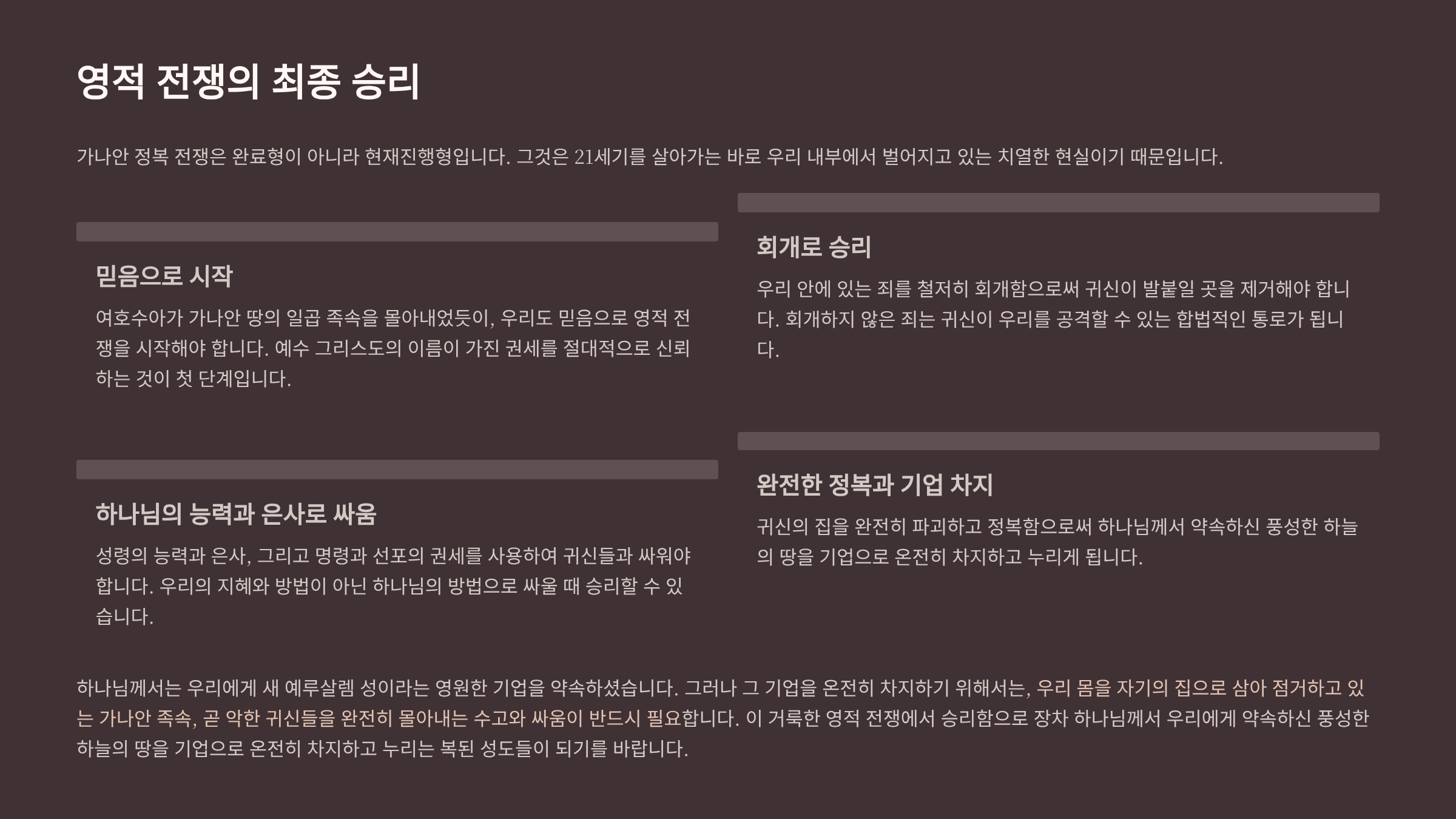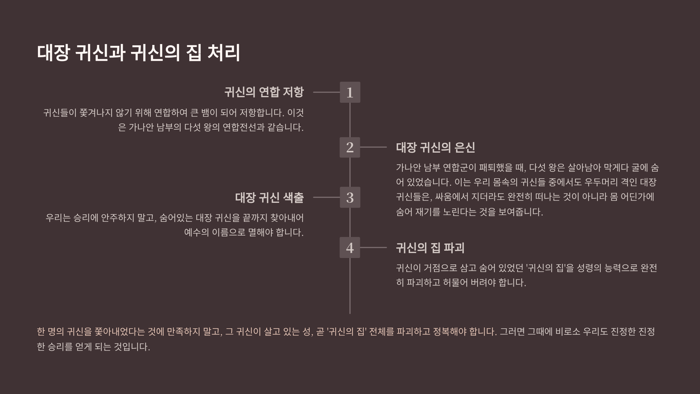 본 설교는 가나안 정복 전쟁을 성도가 자기 육체 속의 귀신들을 쫓아내는 영적 전쟁으로 해석한다. 여리고 정복은 ‘믿음’으로, 아이 성 패배와 승리는 ‘회개’의 중요성을 보여준다. 가나안 남부 연합군은 성도 안의 귀신들이 쫓겨나지 않기 위해 연합하여 ‘큰 뱀’을 이루는 것과 같으며, 막게다 굴에 숨은 왕들은 재기를 노리는 대장 귀신을 상징한다. 따라서 성도는 인간의 방법이 아닌 믿음, 회개, 성령의 은사 등 하나님의 방법으로 싸워야 하며, 대장 귀신을 죽이고 ‘귀신의 집’을 완전히 파괴할 때 비로소 내 안의 가나안을 정복하고 온전한 승리를 얻을 수 있음을 역설한다.