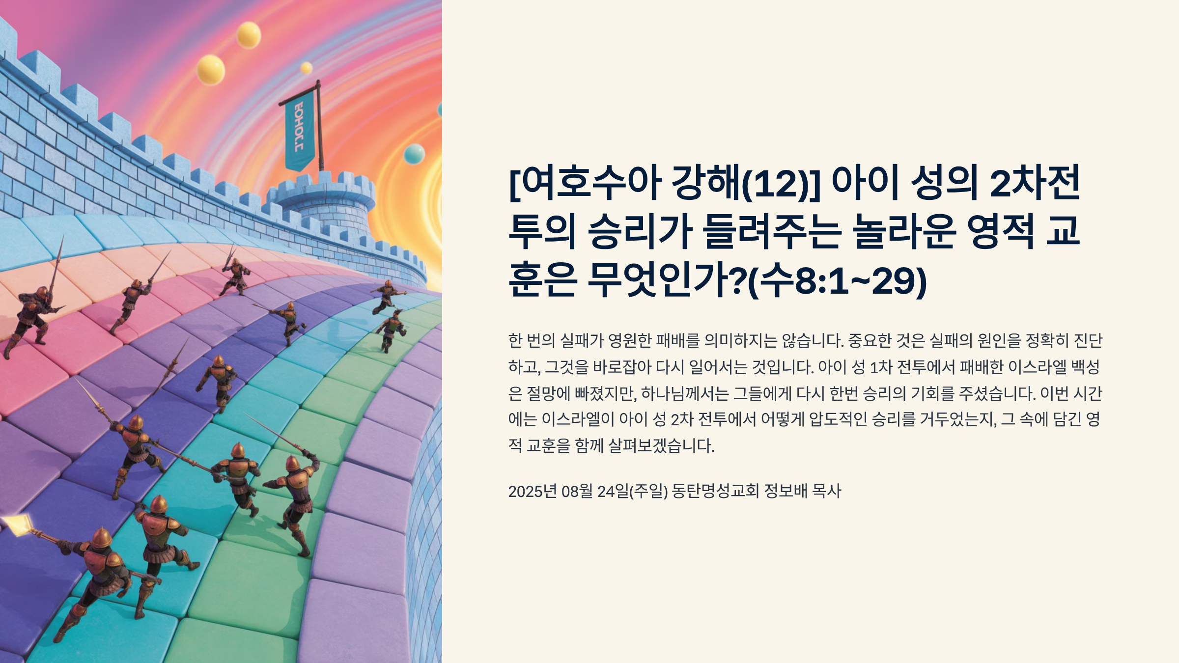 제목: [여호수아 강해(12)] 아이 성의 2차전투의 승리가 들려주는 놀라운 영적 교훈은 무엇인가?(수8:1~29)_동탄명성교회 정보배목사