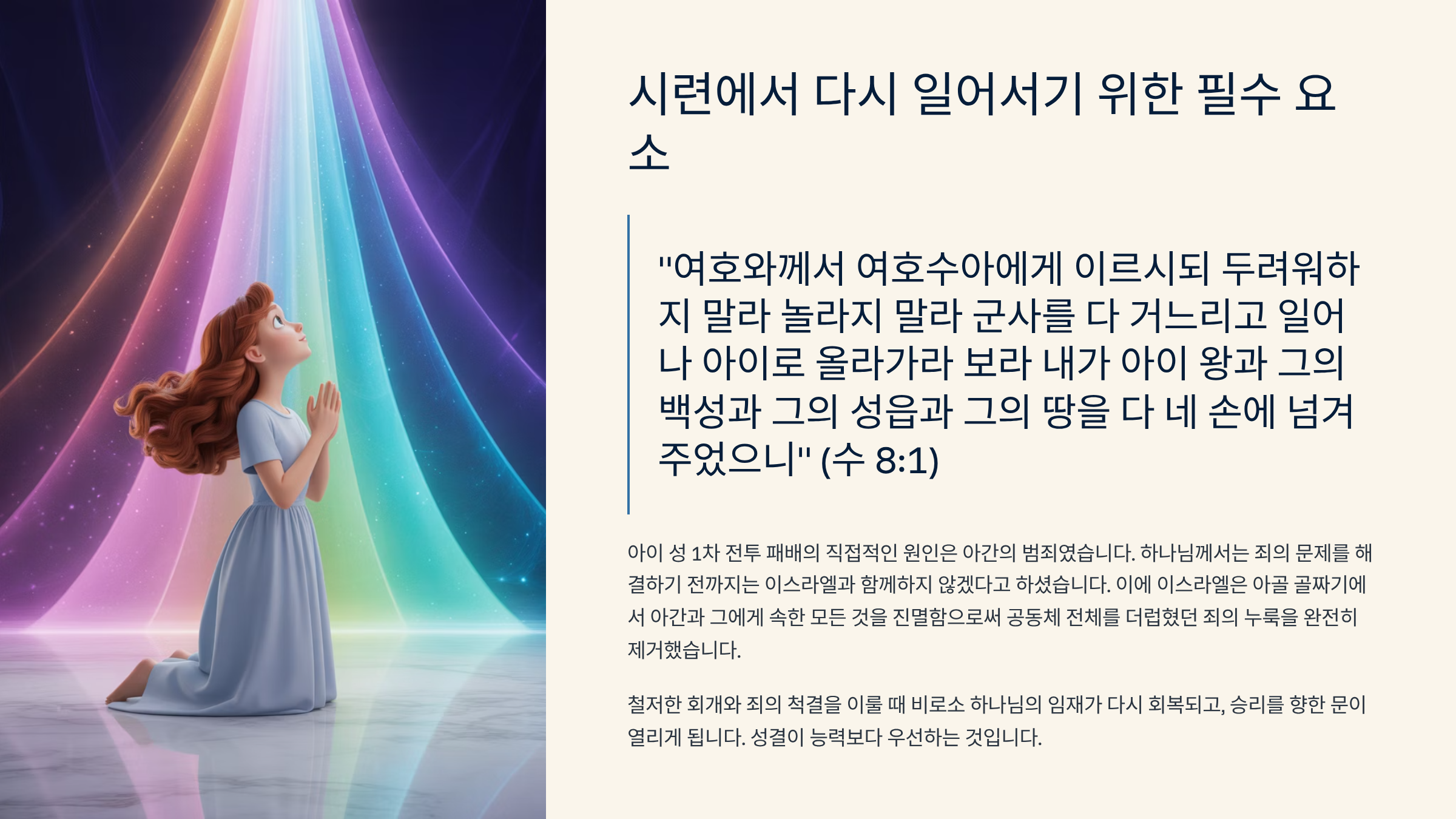 한 번의 실패가 영원한 패배를 의미하지는 않는다. 중요한 것은 실패의 원인을 정확히 진단하고, 그것을 바로잡아 다시 일어서야 한다는 것이다. 아이 성 1차 전투에서 뼈아픈 패배를 경험한 이스라엘 백성은 절망의 나락으로 떨어지고 말았다(수 7:5). 그러나 하나님께서는 그들을 그 자리에 내버려두지 않으셨다. 아간의 죄라는 패배의 근본 원인을 제거하게 하시고, 다시 한번 승리의 기회를 주셨기 때문이다. 따러서 이번 시간에는 이스라엘이 아이 성 2차 전투에서 어떻게 압도적인 승리할 수 있었는지를 살펴보고자 한다. 왜냐하면 1차 전투 때와는 완전히 다른 결과를 얻었기 때문이다. 그렇다면 무엇이 과연 패배를 승리로 바꾸어 주었는가? 이 극적인 반전 속에는 영적 전쟁에서 승리하기 위한 핵심적인 원리들이 고스란히 담겨 있었다. 사실 하나님께서는 2차 전투를 통해 이스라엘에게 단순히 군사적 승리를 안겨주신 것만이 아니다. 실패를 통해 배우게 하시고, 순종을 통해 역사하시며, 공동체적 헌신을 통해 축복하시는 하나님의 일하심의 방식을 가르쳐주셨기 때문이다. 아이 성 2차 전투의 승리는, 죄의 문제를 해결하고 하나님의 말씀에 온전히 순종하며, 모든 구성원이 함께 헌신할 때 어떤 실패도 능히 딛고 일어서서 위대한 승리를 쟁취할 수 있음을 보여주는 희망의 메시지를 담고 있다. 그래서 이번 시간에 우리도 아이 성 재공격의 승리 요인들을 깊이 분석함으로써, 우리의 삶에서 경험하는 실패와 좌절을 새로운 승리의 출발점으로 삼는 성도가 되기를 바란다.