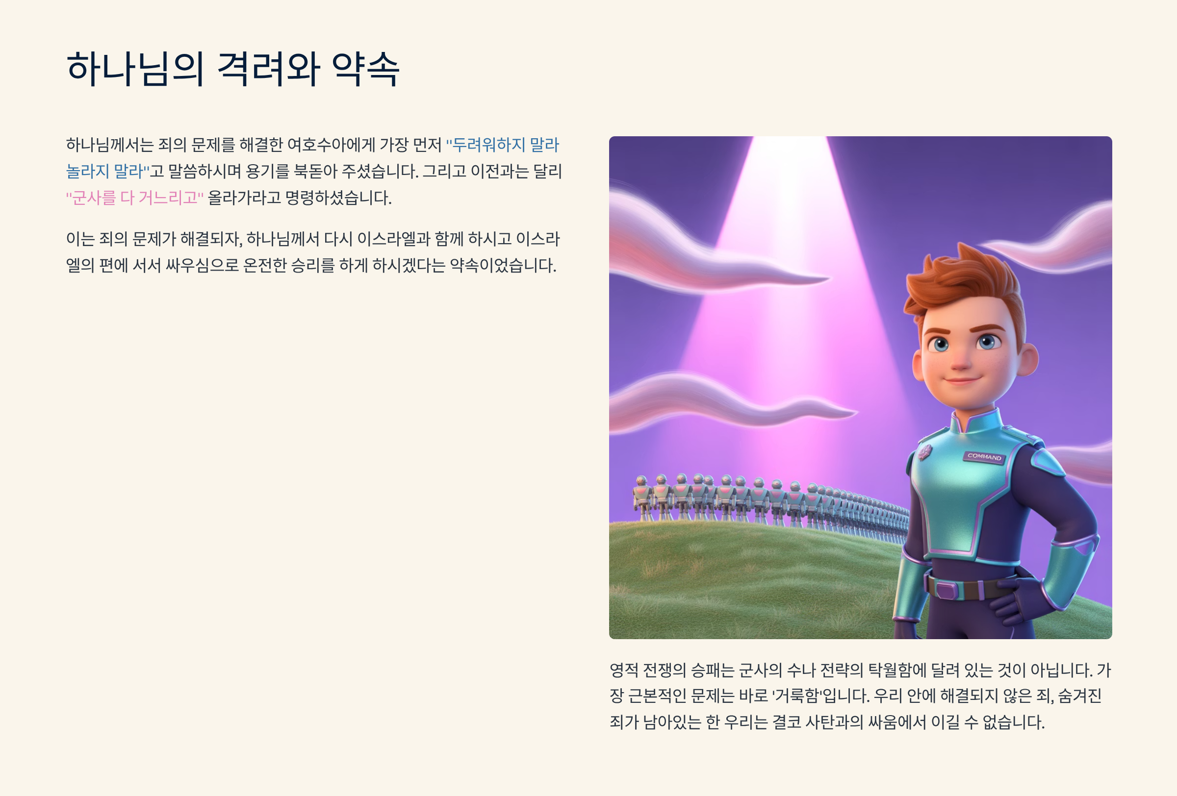 사실 여리고 성의 전투는 첫 열매 전투였기에 모든 전리품을 다 하나님께 바쳐야 했지만, 아이 성에서는 전리품을 이스라엘 백성들이 나누어 가질 수 있도록 허락하셨다. 이는 함께 수고하고 헌신한 모든 사람에게 승리의 기쁨과 보상을 함께 누리게 하시는 하나님의 공의와 사랑을 보여주는 대목이다. 마찬가지로 교회의 부흥과 성장은 목회자나 특정 리더의 힘만으로 이루어지지 않는다. 모든 성도가 한마음으로 기도하고 헌신하며 각자의 역할을 감당할 때, 하나님께서는 승리를 주실 뿐만 아니라, 그 승리의 열매를 온 교회가 함께 풍성히 누리게 되는 것이다.