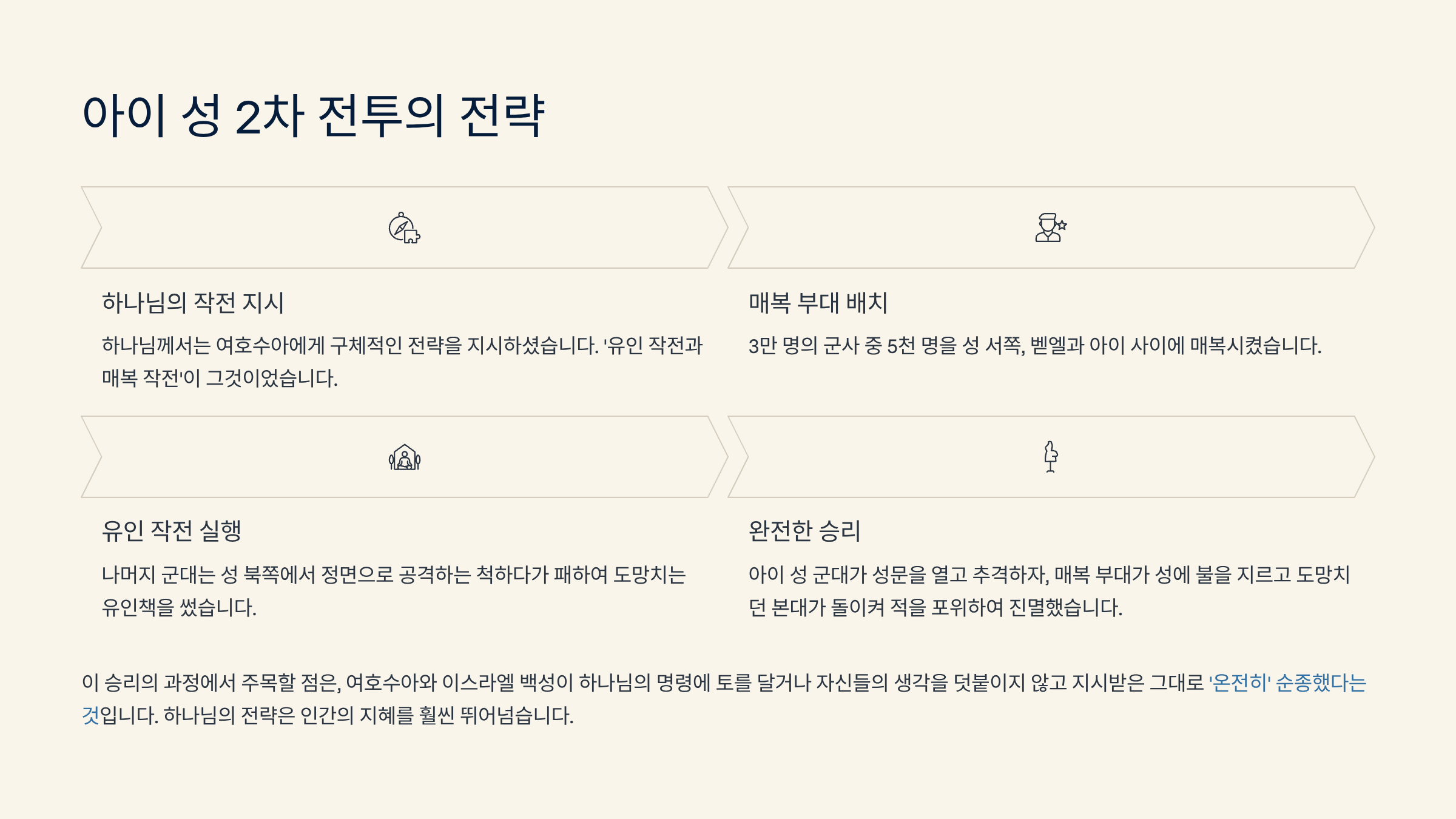아이 성과의 1차 전투에서 이스라엘은 하나님께 묻지 않고 인간적인 판단으로 소수의 병력만 보냈다가 그만 패배하고 말았다. 그러나 이스라엘이 성경을 회복하자, 하나님께서 다시 나타나셔서 여호수아를 격려하신 후에 아이 성의 2차 전투에서 승리할 수 있는 방법을 구체적으로 지시해주신다. 그라저 이스라엘은 하나님의 구체적인 작전 지시를 받고 그대로 순종하게 된다. 이때 하나님께서 지시하신 전략은 바로 ‘유인 작전과 매복 작전’이었다.