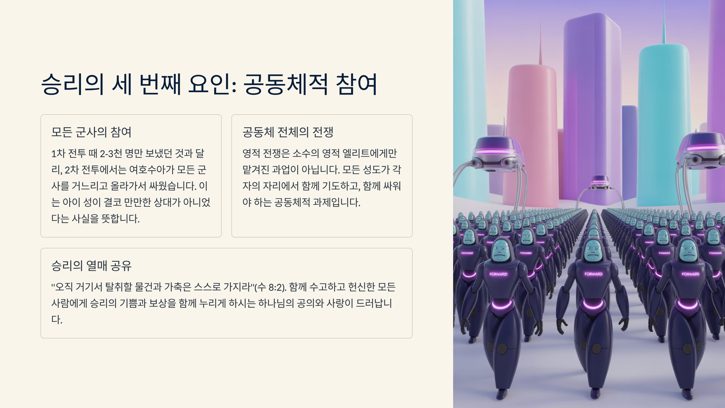 이스라엘이 아이 성과 벌인 2차 전쟁에서 승리할 수 있었던 이유는 무엇인가? 첫째는 성결을 다시 회복했다는 것이다. 둘째는 전쟁에 대한 하나님의 말씀이 먼저 주어졌고 그 말씀에 이스라엘이 순종했다는 것이다. 그러면 셋째는 무엇인가? 그것은 일부의 병력만이 전쟁에 참여하는 것이 아니라 모두가 다 참여했다는 것이다. 이때는 응당 여호수아도 참여하게 된다. 그렇다. 만약 이 때에 소수의 병력만을 보내서 전쟁에서 승리하게 했다면 그들은 전쟁 후에 자신의 지분을 달라고 했을 것이다. 목숨 걸고 싸웠으니까 거기에 합당한 댓가를 요구하는 것이다. 그러자 하나님께서는 어떤 이도 이 전쟁에 대한 지분을 달라고 하지 않도록 모두의 전쟁이 되게 하셨다. 그래서 여호수아는 모든 군사를 거느리고 올라가서 싸웠다. 이는 1차 전투 때 2-3천 명만 보냈던 것과는 대조적인 모습이다. 이것은 아이 성이 결코 만만한 상대가 아니었다는 사실을 뜻하는 동시에, 공동체 전체가 전쟁에 참여해야 한다는 사실을 확실히 가르쳐준다. 영적 전쟁은 소수의 영적 엘리트에게만 맡겨진 과업이 결코 아닌 것이다. 모든 성도가 각자의 자리에서 함께 기도하고, 함께 싸워야 하는 공동체적 과제인 것이다. 이러한 공동체적 참여의 결과로, 하나님께서는 놀라운 승리의 선물을 허락하신 것이다. 더욱이 이번에는 싸워서 쟁취한 전리품들을 전쟁에 나간 모든 용사에게 가지게 하셨다.