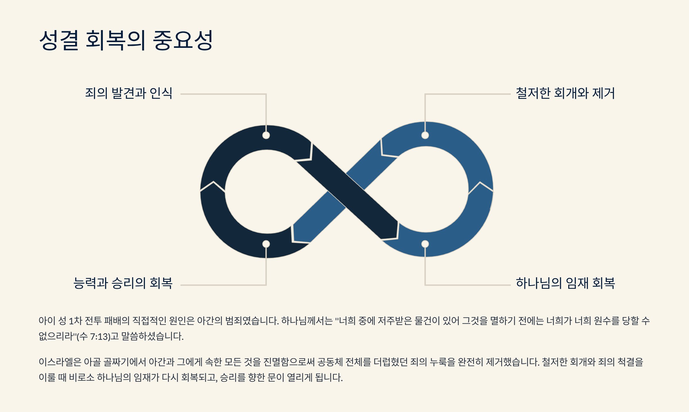 아이 성 1차 전투 패배의 직접적인 원인은 사실 아간의 범죄였다(수 7:11, 20~21). 그런데 그때 하나님께서는 죄의 문제를 해결하기 전까지는 이스라엘과 함께 하지 않겠다고 하셨고 어떤 전쟁에서도 원수들 앞에 능히 맞서지 못할 것이라고 하셨다(수 7:12~13). 이에 이스라엘은 성결을 회복시켰다. 즉 아골 골짜기에서 아간과 그에게 속한 모든 것을 진멸함으로써 공동체 전체를 더럽혔던 죄의 누룩을 완전히 제거하기에 이른 것이다. 그러자 비로소 하나님께서 다시 나타나 여호수아에게 말씀하시고 작전지시를 내려주신다. 그렇다. 이처럼 철저한 회개와 죄의 척결을 이룰 때에 비로소 하나님의 임재는 다시 회복되는 것이고, 승리를 향한 문이 다시 열리게 되는 것이다. 그렇다. 성결이 능력보다 우선하는 것이다.