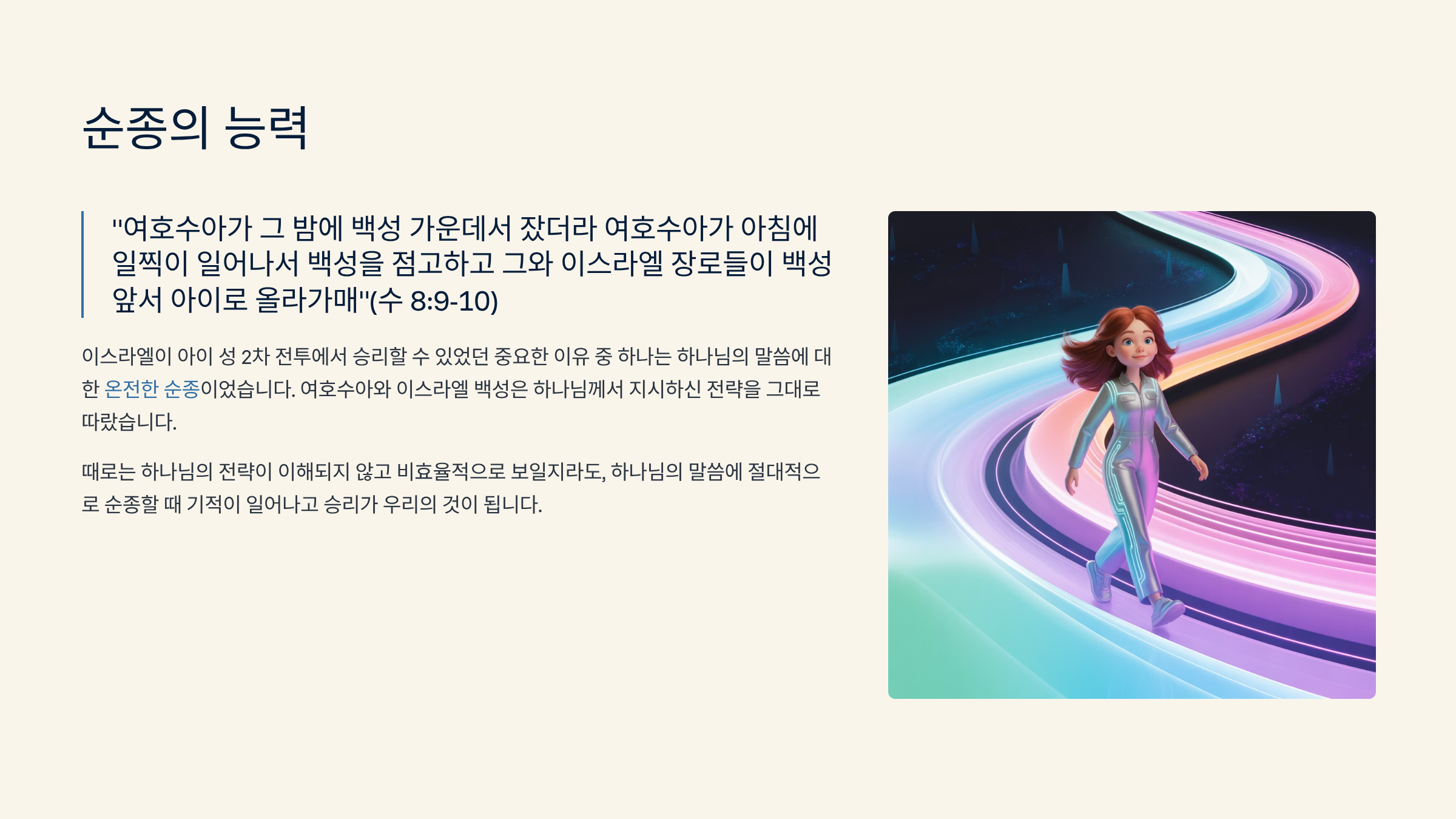 이 승리의 과정에서 주목할 점은, 여호수아와 이스라엘 백성이 하나님의 명령에 토를 달거나 자신들의 생각을 덧붙이지 않았다는 것이다 그리고 지시받은 그대로 ‘온전히’ 순종했다는 것이다. 그러자 전쟁에서 다시 승리하게 된다. 그렇다. 하나님의 전략은 인간의 지혜를 훨씬 뛰어넘는다. 때로는 이해되지 않고 비효율적으로 보일지라도, 하나님의 말씀에 절대적으로 순종해야 한다. 그럴 때 기적이 일어나고 승리가 의 것이 되는 것이다. 이러한 원리는 개인의 삶이든, 교회의 사역이든 마찬가지다. 항상 우리의 계획과 열심보다 앞세워야 하는 것은 하나님의 말씀을 듣고 그대로 행하는 순종인 것이다.