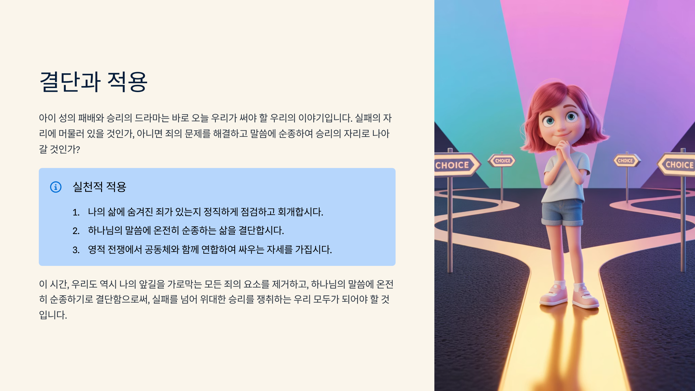 본 설교는 아이 성 1차 전투의 패배를 딛고 2차 전투에서 승리한 과정을 통해 영적 승리의 3대 원리를 제시한다. 첫째, ‘죄 문제의 해결’이다. 아간의 죄를 철저히 청산하자 하나님의 임재가 회복되고 승리의 길이 열렸다. 둘째, ‘말씀에 대한 온전한 순종’이다. 인간적 판단을 버리고 하나님의 구체적인 전략에 그대로 순종했을 때 압도적인 승리를 거두었다. 셋째, ‘공동체 전체의 참여’이다. 모든 백성이 함께 전투에 참여했을 때, 하나님께서는 승리는 물론 전리품이라는 풍성한 보상까지 허락하셨다. 이는 실패가 회개를 통해 새로운 시작이 될 수 있으며, 순종과 공동체적 헌신이 승리의 필수 조건임을 교훈한다.