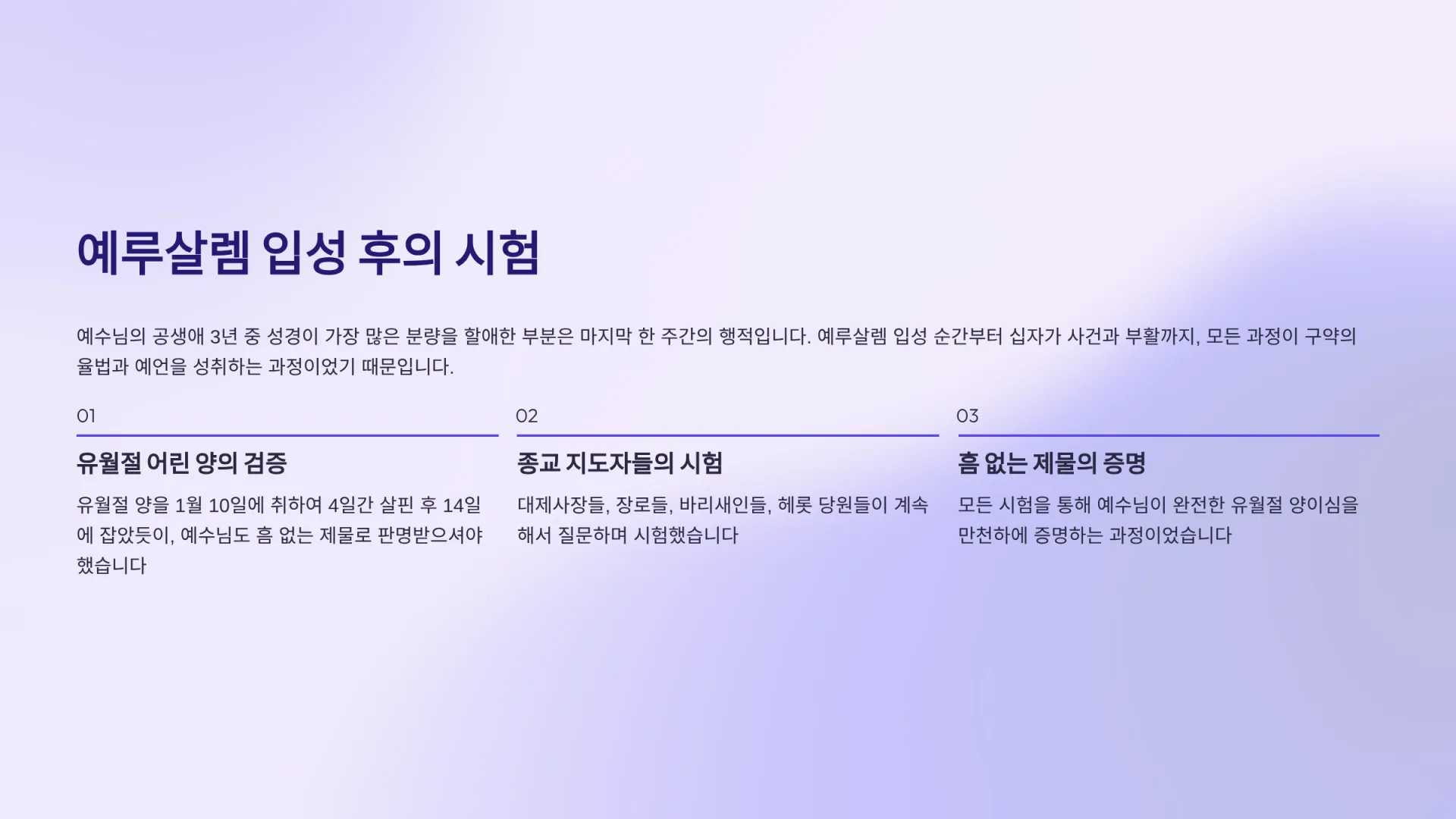 구약성경에 따르면 예수께서는 유월절 어린 양으로 드려지시기 위해서는 흠 없는 제물로 판명받으셔야 했다(출 12:3-6). 유월절 양을 1월 10일에 취하여 4일간 살핀 후 14일에 잡았듯이, 예수께서도 예루살렘에 입성하신 후 종교 지도자들로부터 계속해서 시험과 질문을 받으셨다. 이는 그분이 흠 없는 유월절 양이심을 만천하에 증명하는 과정이었다.