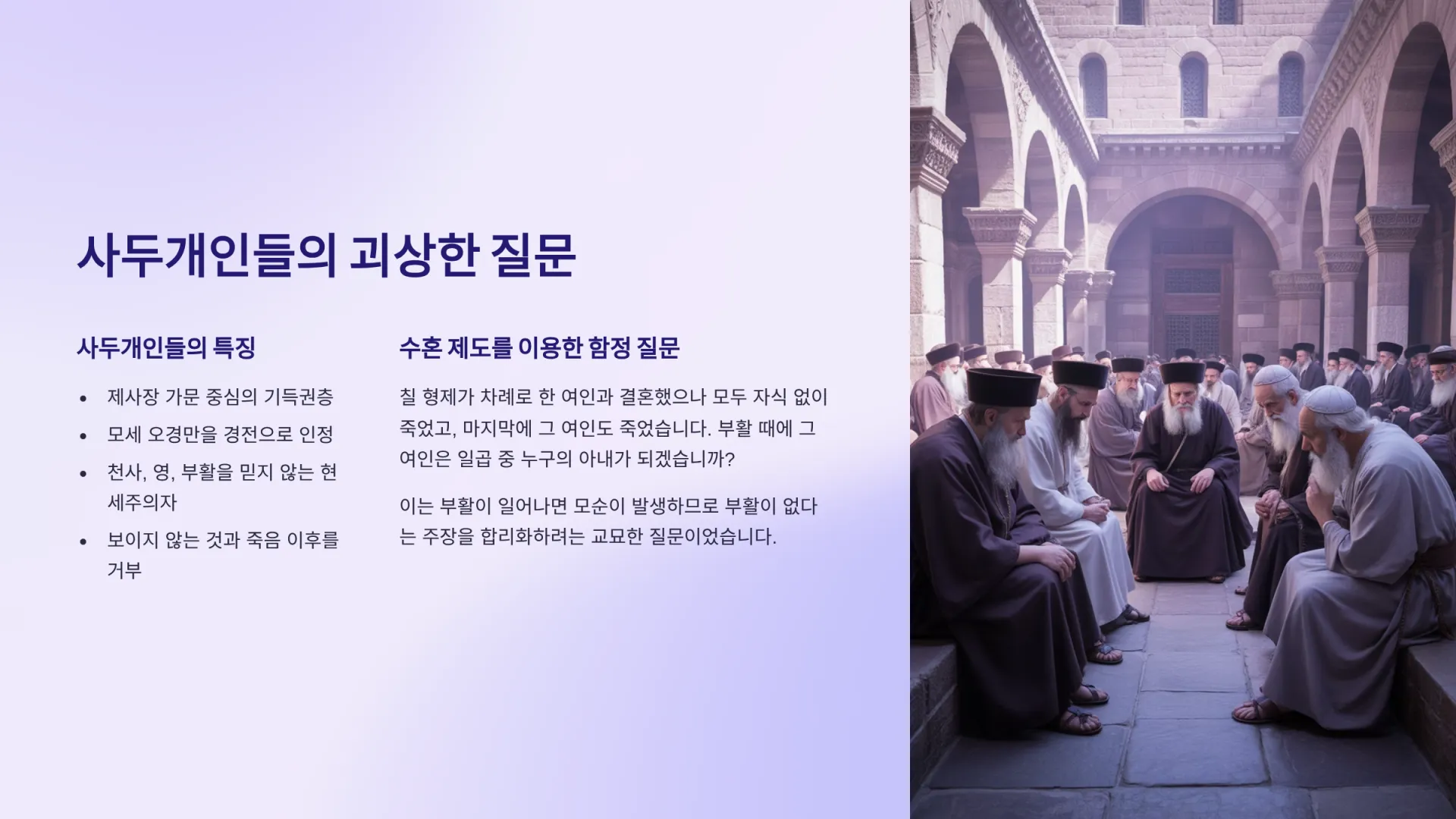 바리새인들과 헤롯당원들의 논쟁이 끝나자 이번에는 부활이 없다고 주장하는 사두개인들이 예수님께로 나아왔다. 사두개인들은 당시 제사장 가문을 중심으로 한 기득권층으로, 모세 오경(창세기~신명기)만을 경전으로 인정하고 천사나 영, 부활과 같은 내세의 소망을 믿지 않는 현세주의자들이었다(행 23:8). 한 마디로 그들은 보이지 않는 것들과 성경이 말씀하고 있는 죽음 이후의 일들 믿지 않은 것이다. 그들은 부활 신앙을 어리석은 것으로 여겼고, 이를 논박하기 위해 모세 오경에 기록된 ‘수혼(嫂婚) 제도(혹은 형사취수 제도, 계대결혼 제도)’(신 25:5-10)를 근거로 괴상한 질문을 만들어냈다. 수혼 제도는 형이 자식 없이 죽으면 동생이 형수와 결혼하여 형의 대를 이어주도록 한 법이다.