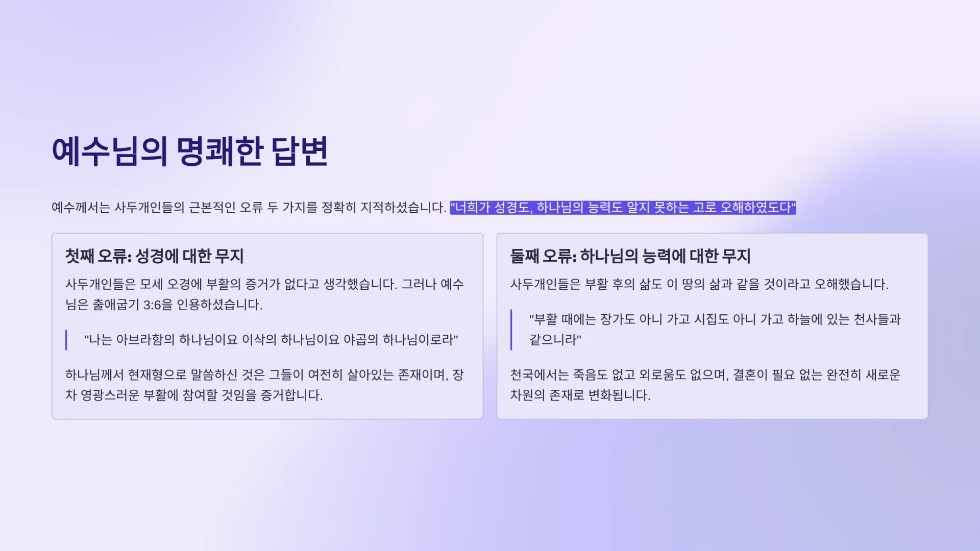 예수께서는 그들의 질문에 직접 답하시기 전에, 그들의 근본적인 오류 두 가지를 정확히 지적하셨다. “너희가 성경도, 하나님의 능력도 알지 못하는 고로 오해하였도다(빗나갔도다)”(마 22:29)고 말씀하셨기 때문이다.