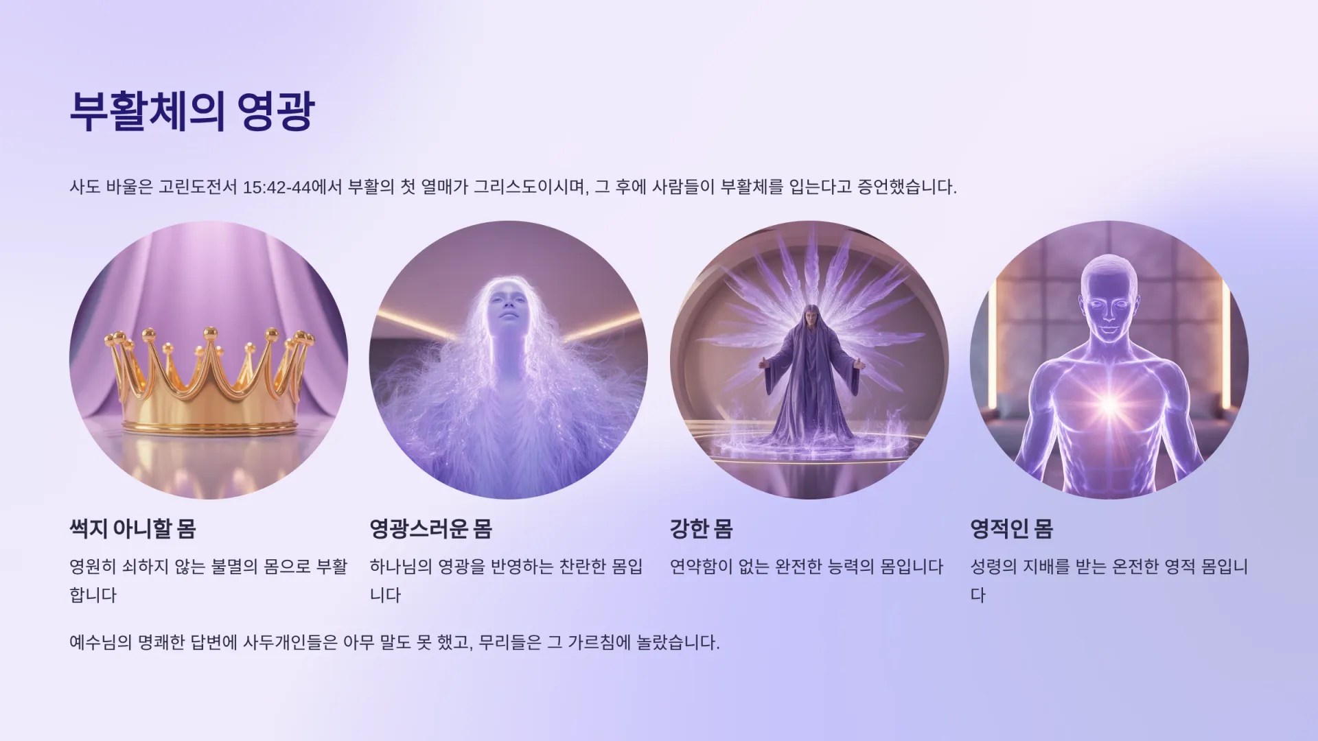 사실 부활의 문제에 대해 신약의 사도였던 바울은 놀라운 증언을 해 준다. 부활의 첫 열매가 그리스도이시며 그 후에 사람들이 부활체를 입는다고 말이다. 그리고 그때 입게 될 부활체는 썩지 아니할 몸이요, 영광스러운 몸이자, 강한 몸이며 영적인 몸으로 부활할 것이라고 했기 때문이다(고전 15:42~44).