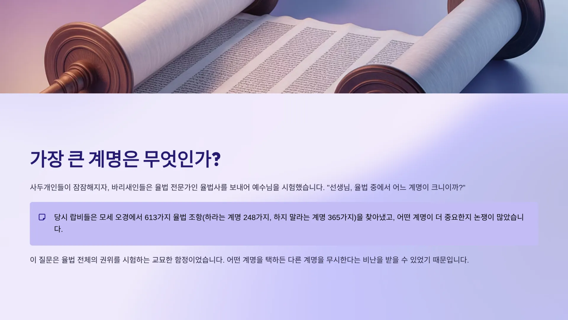사두개인들이 잠잠케 되었다는 것을 지켜 본 바리새인들은 이번에는 율법 전문가인 한 율법사(서기관의 한 부류)를 보내어 예수님을 시험했다. 그는 “선생님, 율법 중에서 어느 계명이 크니이까?”(마 22:36)라고 질문한 것이다. 당시 랍비들은 모세 오경에서 613가지의 율법 조항(하라는 계명 248가지, 하지 말라는 계명 365가지)을 찾아냈는데, 그중 어떤 계명이 더 크고 중요한지에 대한 논쟁이 사실 아주 많았다. 만약 예수님께서 ‘하라’는 계명(예: 안식일 준수, 부모 공경)을 택하면, ‘하지 말라’는 계명(예: 살인, 간음, 도둑질)을 무시하고 십계명 중에 제1계명을 소홀히 여긴다고 비난받을 수 있었고, 그 반대의 경우도 마찬가지였다. 왜냐하면 당시 바리새인들은 모세오경에 613가지 계명들 중에서 '하라'는 계명이 더 중요하교ㅗ, '하지 말라'는 계명이 덜 중요하다고 여기고 있었기 때문이다. 그러므로 이러한 질문은 율법 전체의 권위를 시험하는 교묘한 질문이었다. 그러나 예수께서는 이 질문에 대해 율법의 핵심을 꿰뚫는 완벽한 답변을 주셨다.