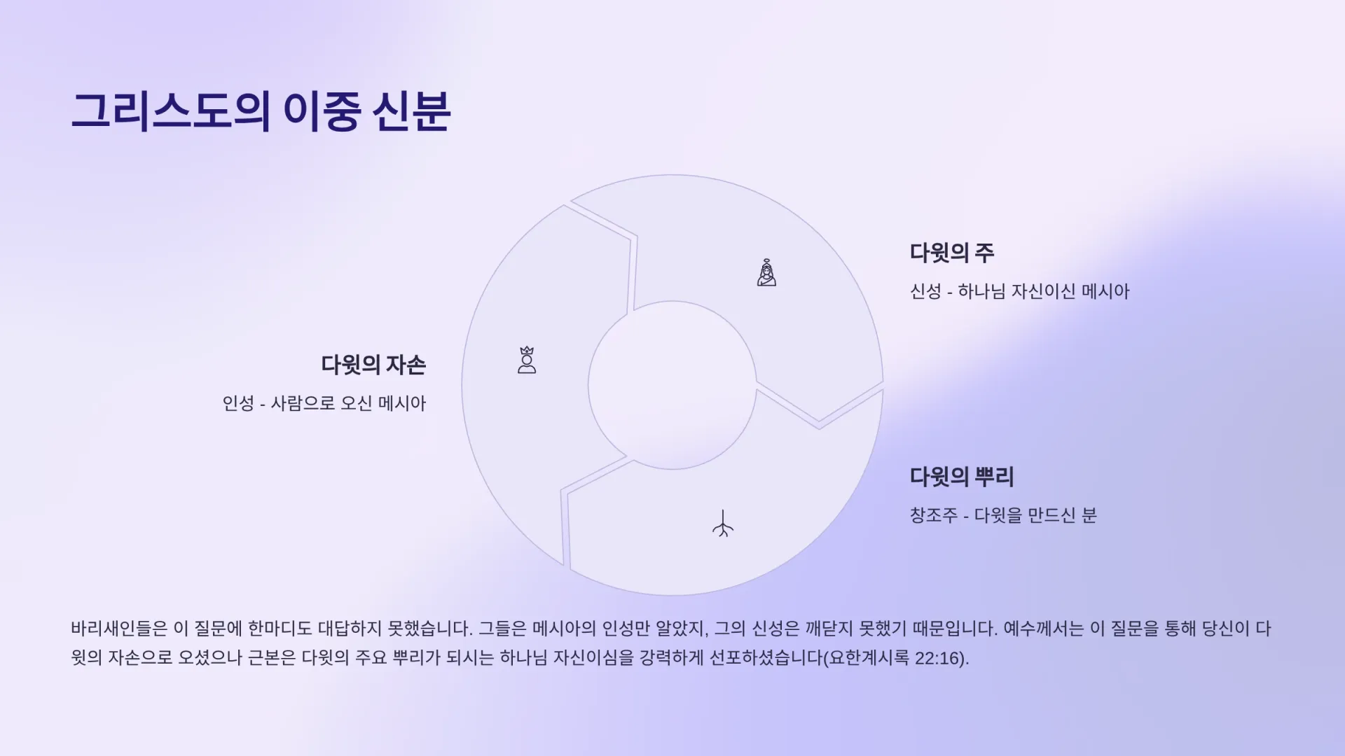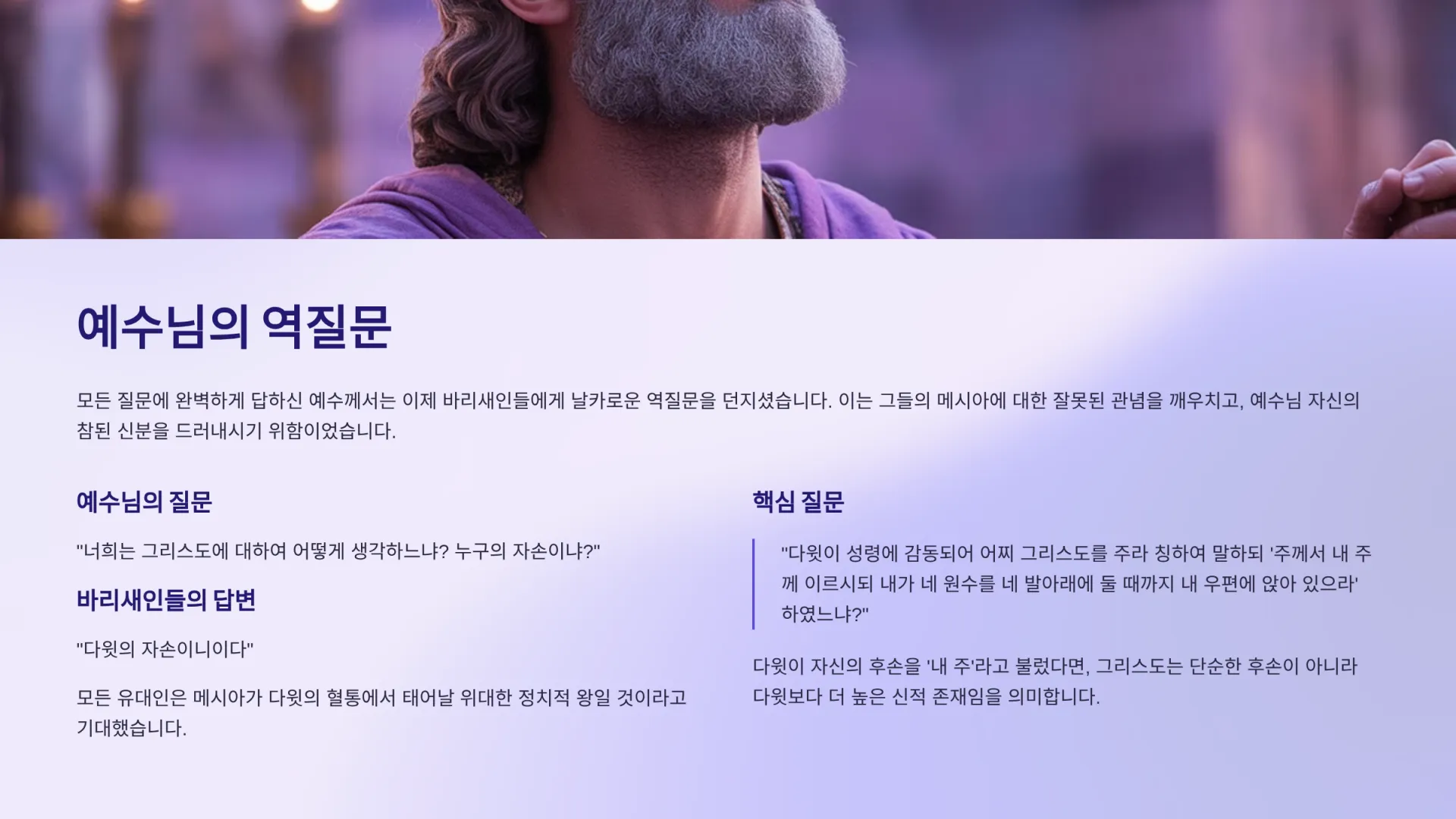 사두개인과 율법사의 질문에 완벽하게 답하신 예수께서는, 이제 반대로 바리새인들에게 날카로운 역질문을 던지셨다. 이는 논쟁에서 승리하기 위함이 아니라, 그들이 가진 메시아(그리스도)에 대한 잘못된 관념을 깨우쳐주시고, 예수님 자신의 참된 신분(신성)이 무엇인지를 드러내시기 위함이었다.