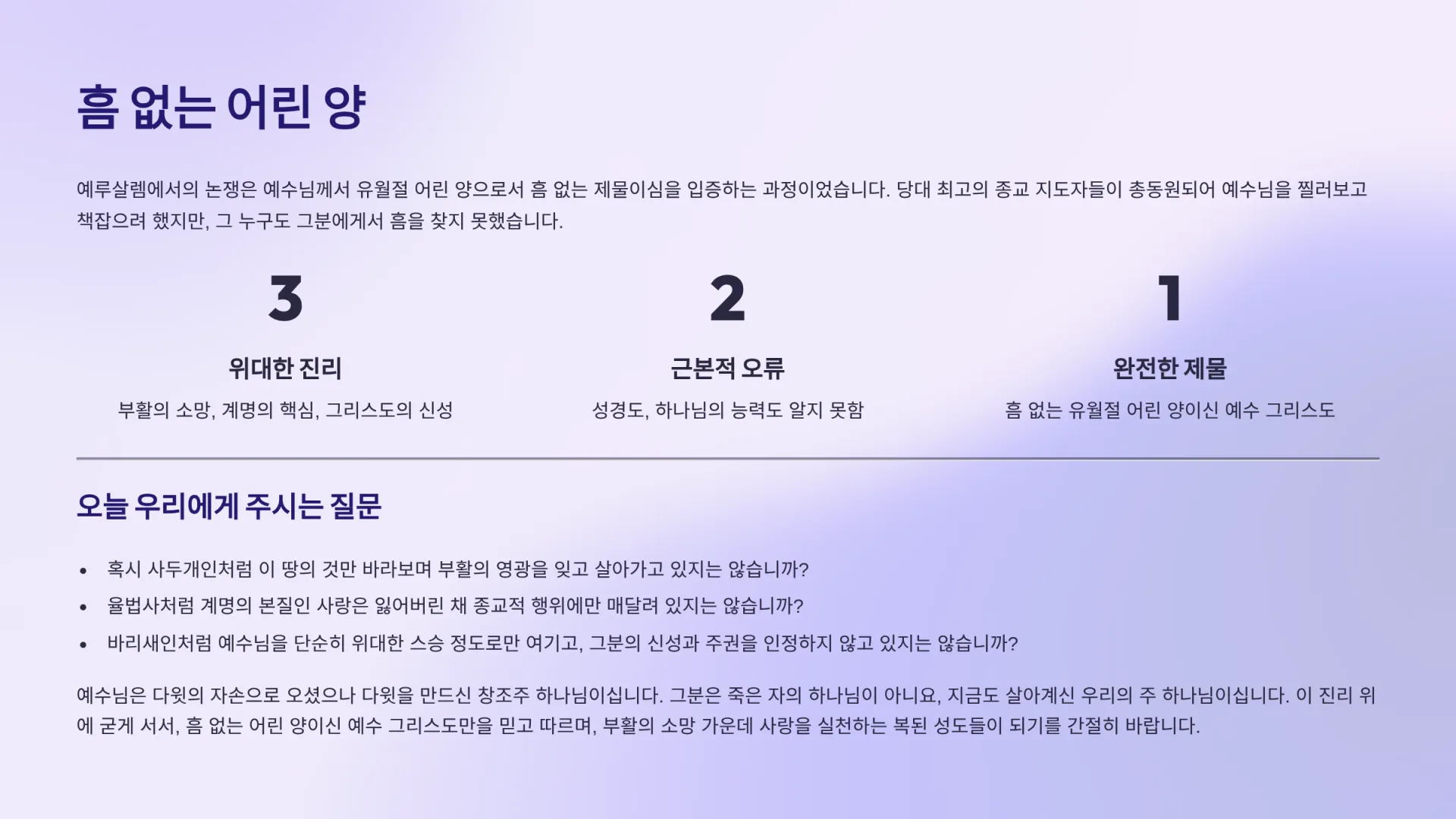 예루살렘에서의 논쟁은 예수님께서 유월절 어린 양으로서 흠 없는 제물이심을 입증하는 과정이었다. 당대 최고의 종교 지도자들이었던 대제사장들, 장로들, 바리새인들, 헤롯 당원들, 사두개인들, 율법사들까지 총동원되어 예수님을 찔러보고 책잡으려 했지만, 그 누구도 그분에게서 흠을 찾지 못했다. 오히려 예수께서는 그들의 모든 질문을 통해 당신의 신적인 지혜와 권위를 드러내셨고, 부활의 소망, 계명의 핵심, 그리고 그리스도의 신성이라는 위대한 진리를 가르쳐 주셨다.