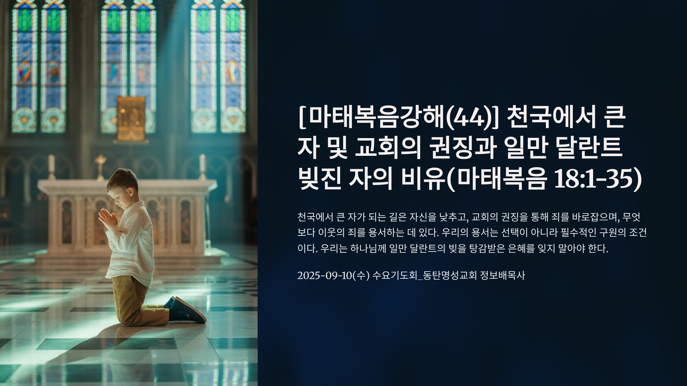 제목: [마태복음강해(44)] 천국에서 큰 자 및 교회의 권징과 일만 달란트 빚진 자의 비유(마태복음 18:1-35)_동탄명성교회 정보배목사