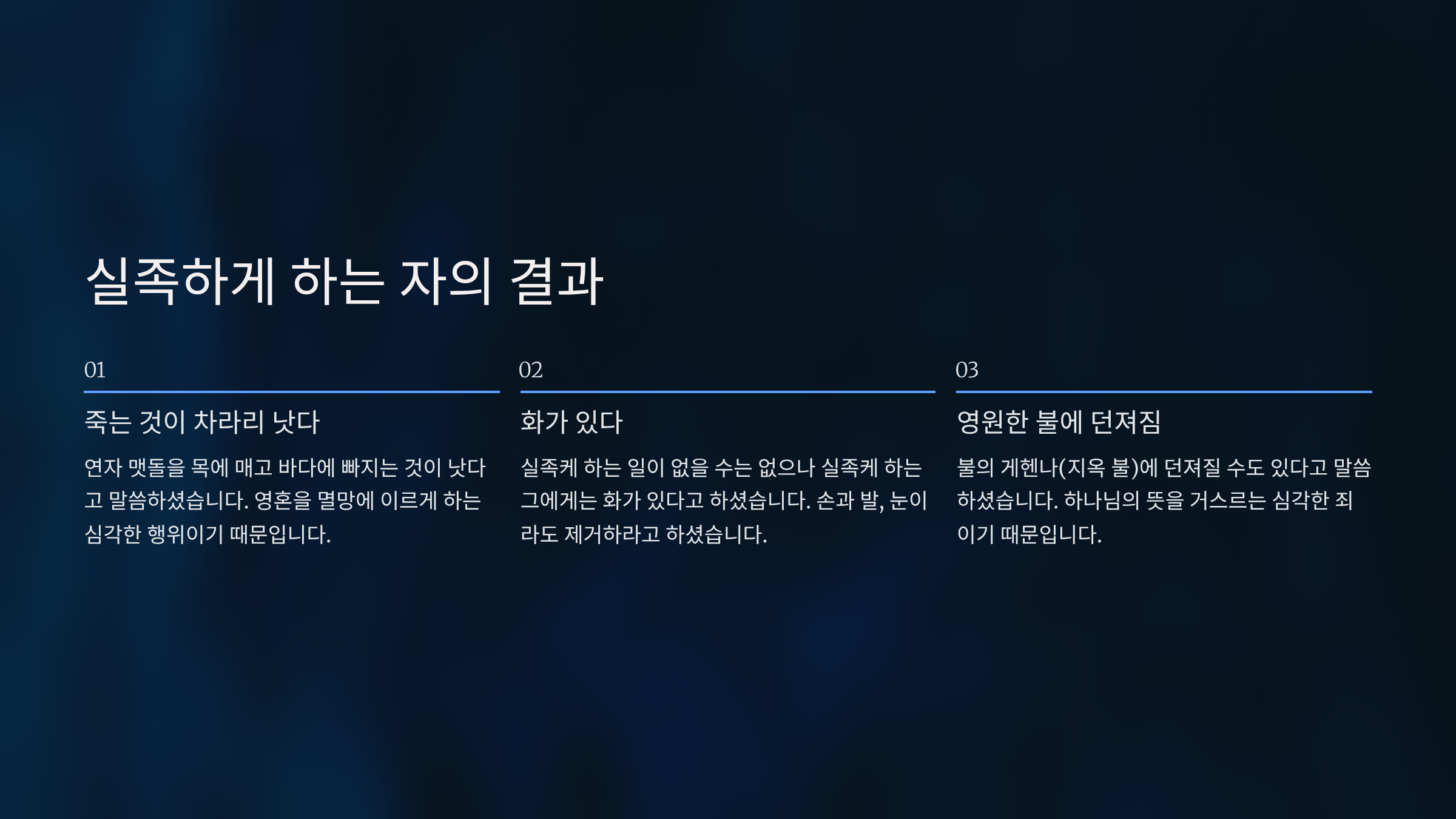 셋째, 이러한 자들이 영원한 불 곧 불의 게헌나(지옥 불)에 던져질 수도 있다고 말씀하셨다(마 18:8-9). 실족케 하는 일은 그리 단순한 일이 아니다. 믿음이 약한 자를 실족케 하여 그가 걸려넘어진다면 그것에 대한 합당한 형벌이 그를 기다리고 있는데 그것은 그가 지옥 불에 던져지는 것이다. 그러므로 우리는 작은 자 하나라도 업신여기지 말아야 한다. 왜냐하면 그들의 천사들이 항상 하늘에 계신 아버지의 얼굴을 뵙고 보고하고 있기 때문이다(마 18:10). 하나님은 잃어버린 양 한 마리를 찾으시는 목자처럼, 작은 자 하나라도 잃어버리는 것을 결코 원하지 않으신다는 것을 알아야 한다. 실족하게 하는 죄는 곧 하나님의 뜻을 거스르는 심각한 죄이기 때문이다.