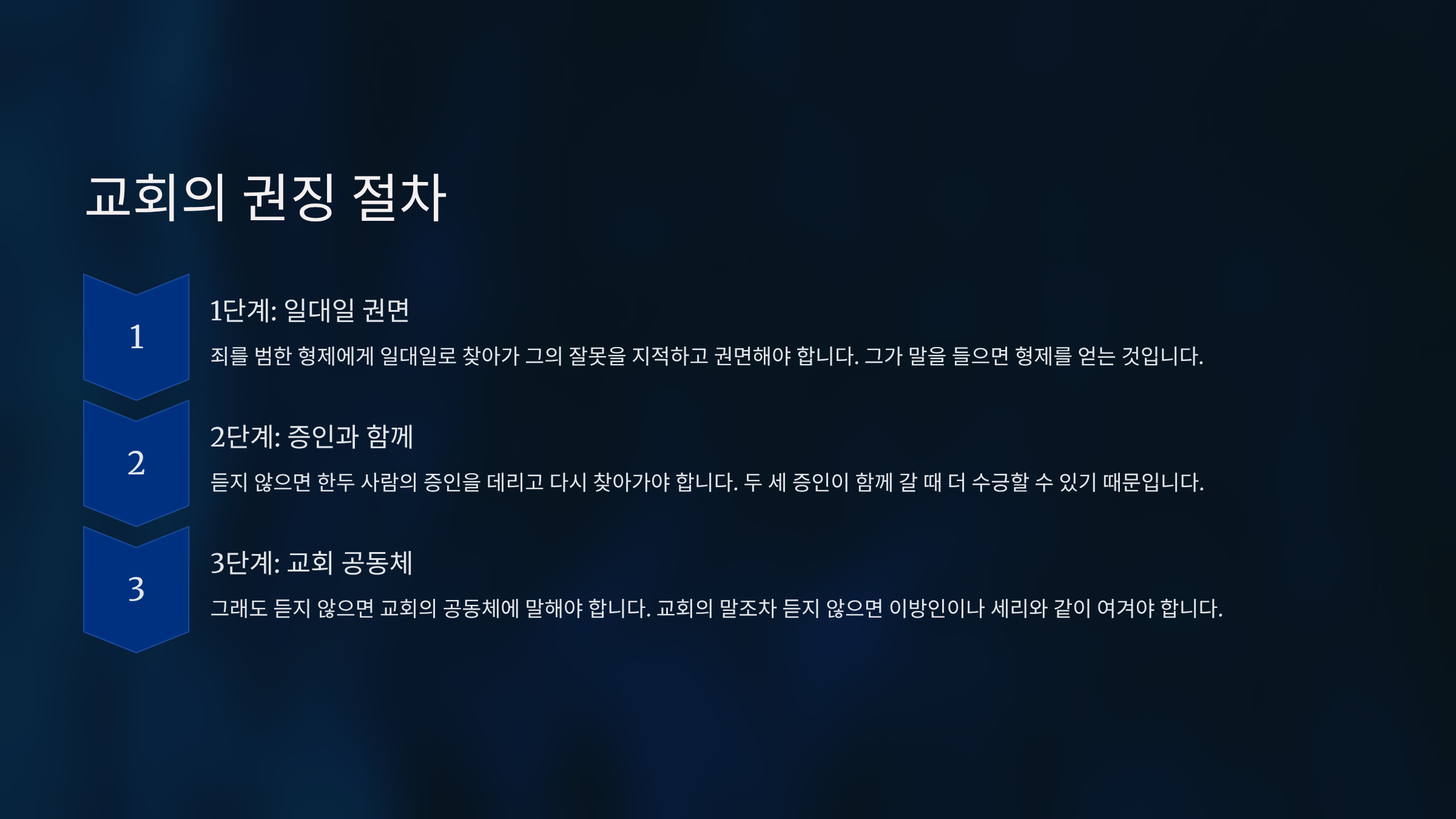 첫째, 죄를 범한 형제에게 일대일로 찾아가 그의 잘못을 지적하고 권면해야 한다는 것이다(마 18:15). 만일 그가 그 말을 듣는다면 형제를 얻는 것이다. 둘째, 그래도 그가 듣지 않는다면 한두 사람의 증인을 데리고 다시 찾아가야 한다고 하셨다(마 18:16). 왜냐하면 자신의 잘못을 혼자가 가서 권책하는 것보다 두 세 증인이 함께 가서 권책할 때에 더 수긍할 수 있기 때문이다. 셋째, 그럼에도 불구하고 그가 듣지  않는다면 그때에는 교회의 공동체에 말해야 한다고 하셨다(마 18:17). 그런데 만일 교회의 말조차 듣지 않는다면 그를 이방인이나 세리와 같이 여겨야 한다고 하셨다(마 18:17). 이는 단순히 관계를 끊는 것이 아니라, 그의 구원을 위해 최후의 경고를 해야 한다는 뜻이다.