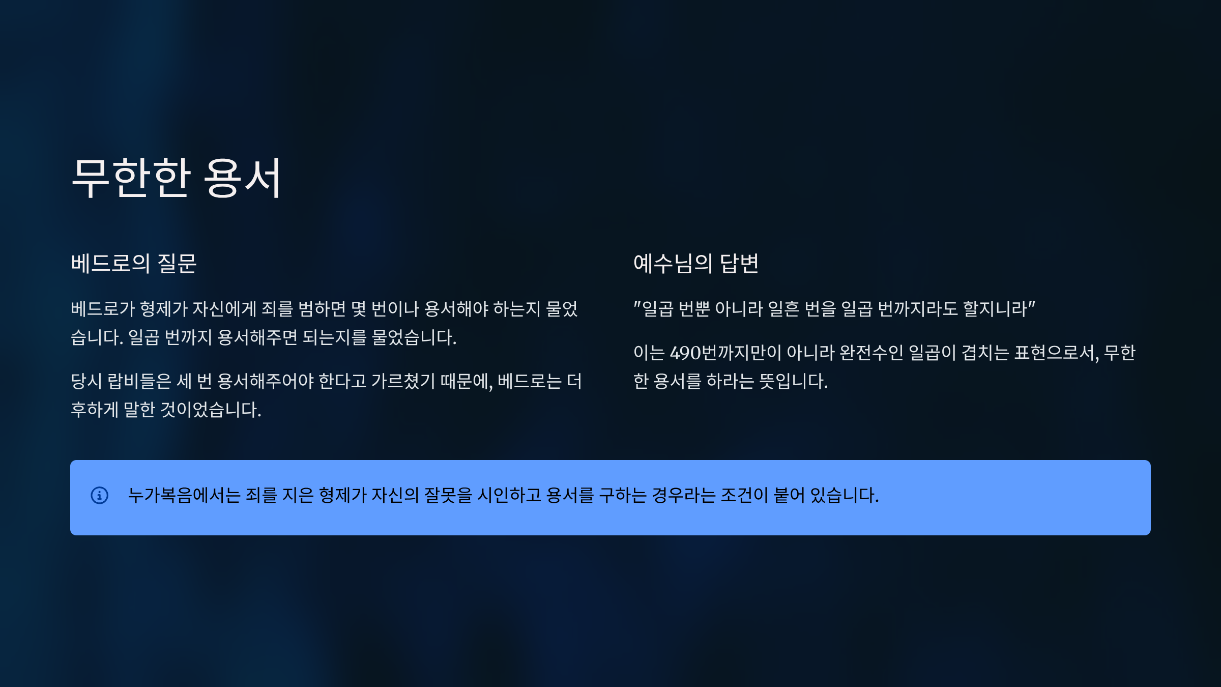 그때였다. 베드로가 나아오더니 형제가 자신에게 죄를 범하면 몇 번이나 용서해야 하는지 묻는다(마 18:21). 이때 베드로는 일곱 번까지 용서해주면 되는지를 물었다. 이는 당시 랍비들은 세 번 용서해주어야 한다고 가르쳤기 때문에, 더 후하게 말씀한 것이다. 그러자 예수께서는 "일곱 번뿐 아니라 일흔 번을 일곱 번까지라도 할지니라"라고 말씀하셨다(마 18:22). 이는 490번까지만 용서하라는 뜻인가? 그건 아닐 것이다. 아무도 죄를 지었는데 490번까지 와서 죄용서를 해 달라고 요청할 사람은 없을 것이기 때문이다 고로 이것은 완전수인 일곱이라는 숫자가 몇 번 겹치는 표현으로서, 무한한 용서를 하라는 뜻일 것이다.