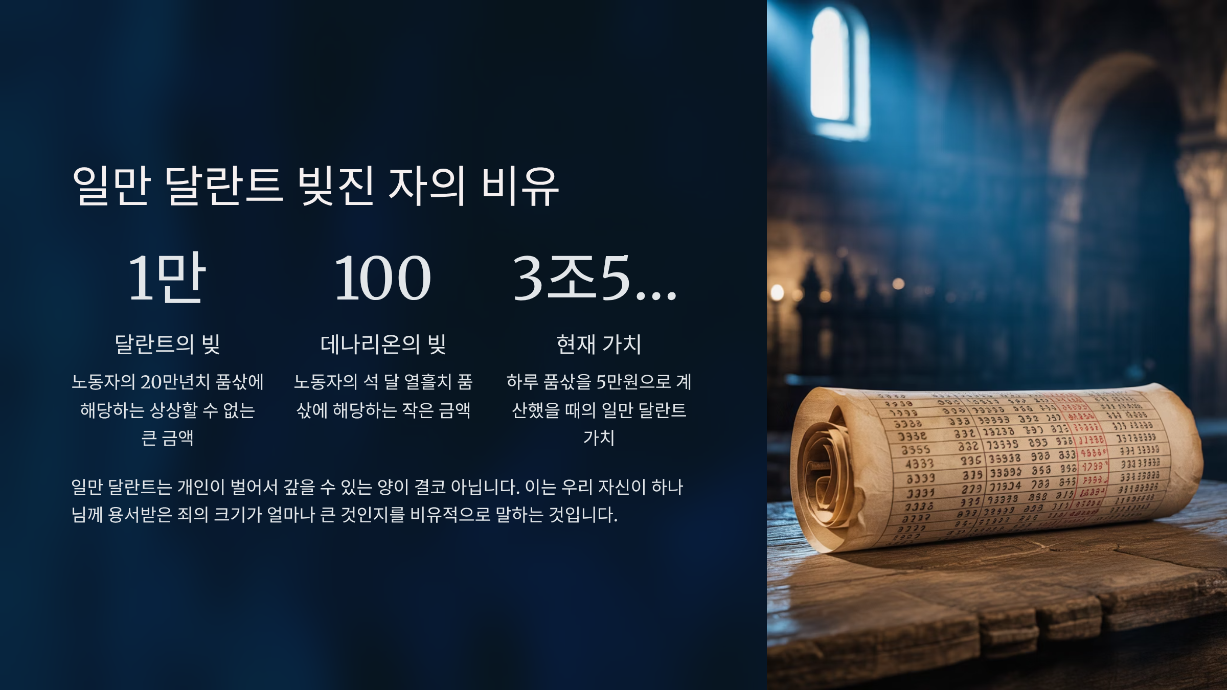 당시 1만 달란트의 액수는 당시 상상할 수 없을 만큼 큰 금액이다. 왜냐하면 1만 달란트는 6,000데나리온이었기 때문이다. 1데나리온이 노동자의 하루 품삯이었으니, 1만 달란트는 노동자의 20만년치의 품삯이라고 할 수 있다. 만약 하루 품삯의 값을 5만원만으로 계산해도 이는 3조5천억 원어치의 값이다. 그러므로 이것은 개인이 벌어서 갚을 수 있는 양은 결코 아니다. 주인은 그 종이 그 빚을 다 갚으려면 자신과 자신의 자식들과 그가 가지고 있는 모든 소유를 다 팔아서 갚아야 한다고 했다. 하지만 그렇게 해서 돈을 모은다고 해도 그것은 턱없이 부족한 액수다. 고로 이 종이 빚진 양은 우리 자신이 하나님께 용서받은 죄의 크기가 얼마나 큰 것인지를 비유적으로 말하는 것이다. 그런데 주인은 그 종에게 1만 달란트의 빚을 탕감해 주었다. 왜냐하면 그가 엎드려 빌면서 참아주시면 그것을 다 갚겠다고 말했기 때문이다. 그런데 그 다음이 문제였다.