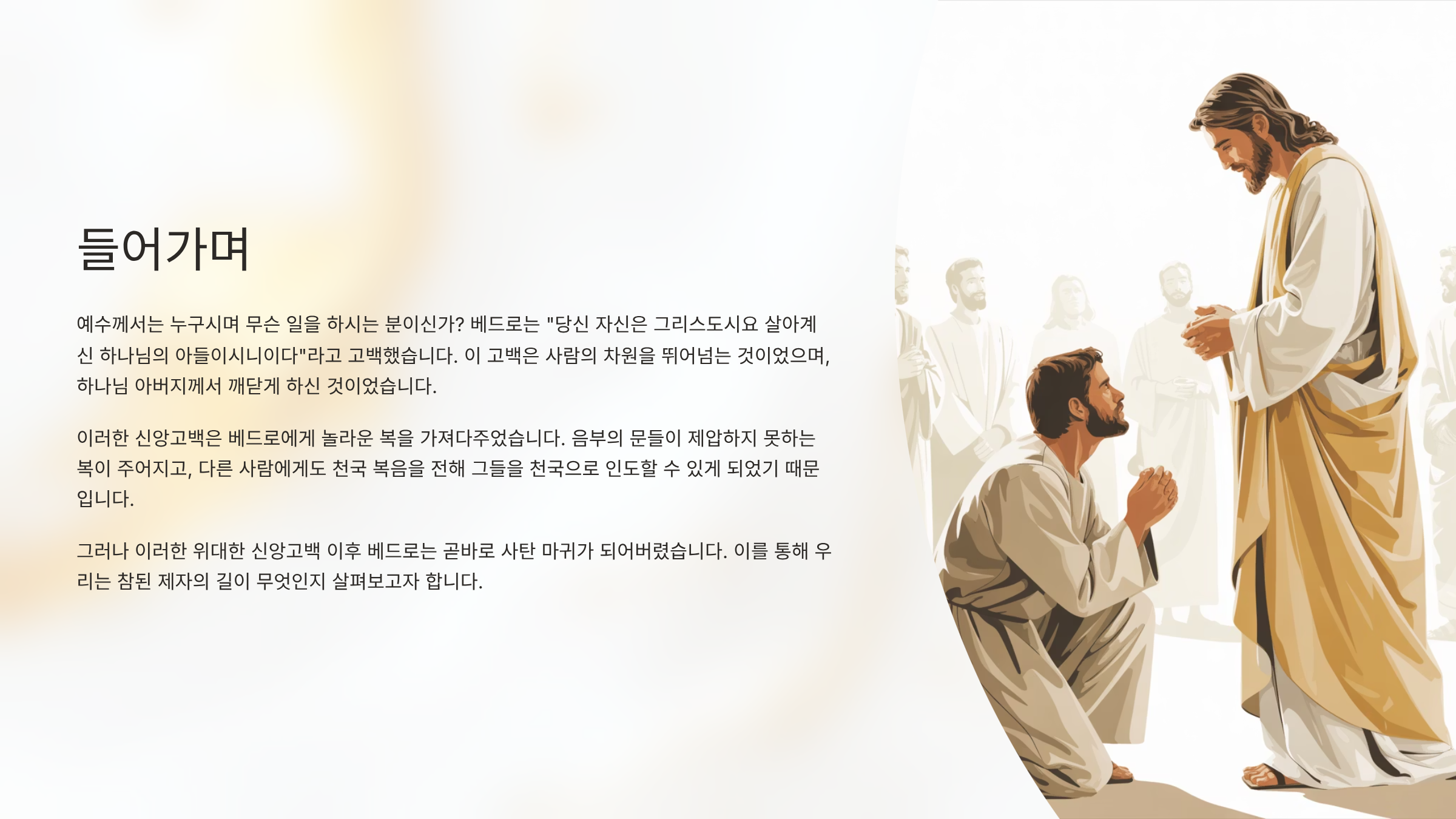 베드로의 신앙고백은 사실 하나의 질문에서 비롯된 것이었다. 그때에 예수께서는 제자들을 향해 물었다. "사람들이 인자를 누구라 하더냐?" 이는 단순한 호기심이 아니라, 당신을 믿고 따르는 이들이 당신을 어떻게 인식하고 있는지 그리고 그 믿음의 깊이가 어느 정도인지를 확인하고자 하는 질문이었다. 그때 제자들은 먼저 세상 사람들의 소리를 전한다. 더러는 세례 요한, 더러는 엘리야, 또 다른 이들은 예레미야나 선지자 중의 하나라 한다고 말이다. 그런데 세상의 평가는 이처럼 다양한 것이었지만, 그 어느 것도 예수의 본질을 꿰뚫고 있지는 못했다. 그런데 이때였다. 예수께서는 제자들에게 다시 묻는다. "그러면 너희는 나를 누구라 하느냐?" 바로 이 질문에 대한 대답이 기독교 신앙의 역사를 바꾸게 된다. 어느 정도 침묵이 흐르는 가운데, 시몬 베드로가 입을 열어 말한다. 그때 그의 입에서 나온 고백은 매우 짧았지만, 그 어떤 웅변보다도 강력했다. 왜냐하면 그는 "주(당신 자신)는 그리스도시요 살아 계신 하나님의 아들이시니이다."(마16:16)라고 고백했기 때문이다. 그런데 이 고백은 단순한 칭찬이나 즉흥적인 대답이 아니었다. 이는 성령의 감동으로 말미암은, 인간의 지혜를 넘어선 신앙의 선포였기 때문이다.