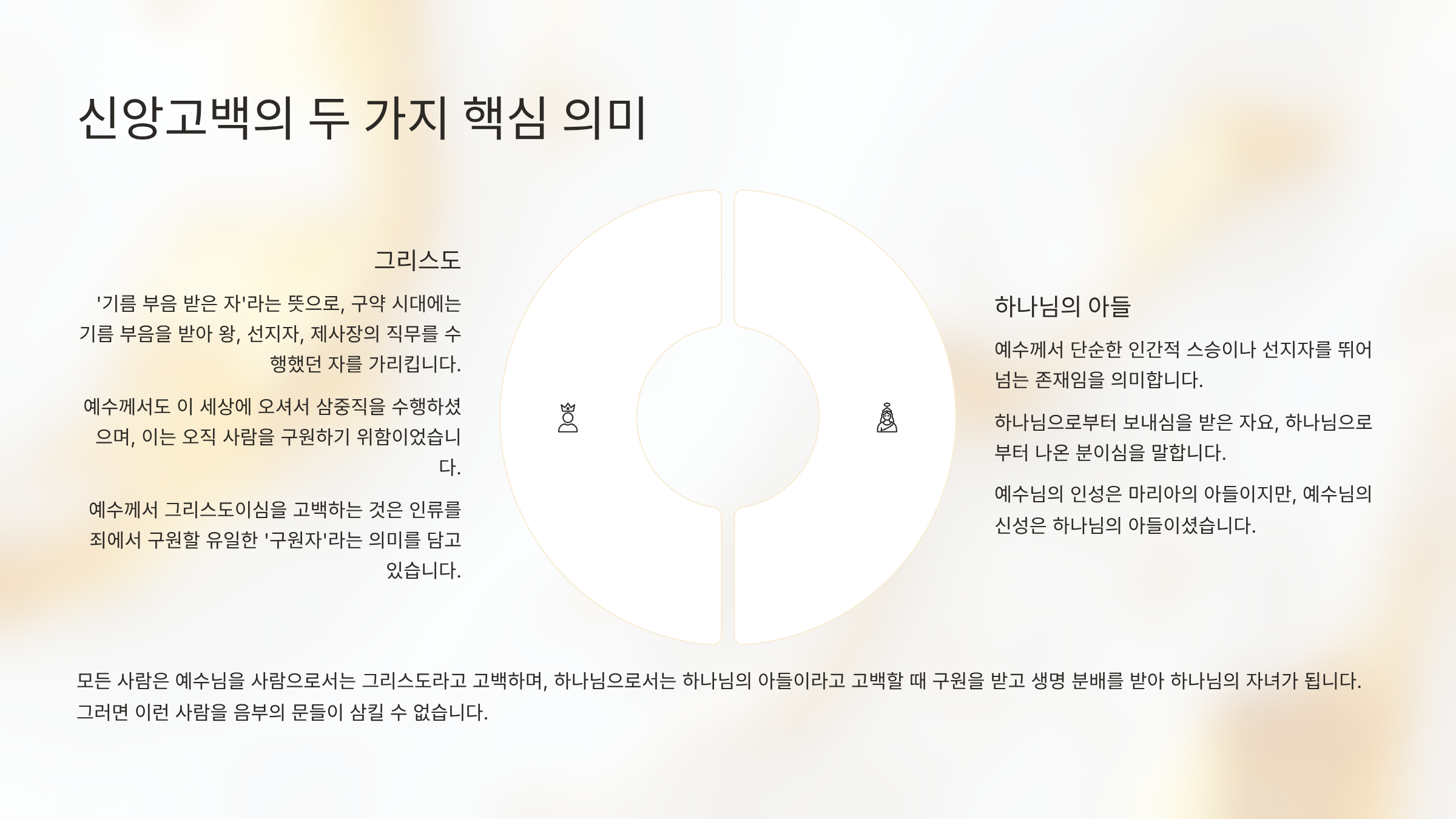 그리고 이 고백 속에는 두 가지 핵심적인 의미가 담겨 있다. 첫째, 이 고백은 그분이 무슨 일을 하실 것인지를 담고 있기 때문이다. 그것은 곧 그분이 ‘그리스도’라는 것이다. 여기서 '그리스도'라는 말은 ‘기름 부음 받은 자’라는 뜻으로서, 구약 시대에는 기름 부음을 받아서 왕, 선지자, 제사장의 직무를 수행했던 자를 가리킨다. 그랬다. 예수께서도 이 세상에 오셔서 삼중직을 수행하였다. 그런데 이러한 삼중직은 오직 한 가지, 사람을 구원하기 위해서 그렇게 하신 것이다. 그러므로 예수께서 그리스도이신 것을 고백하는 것은 사실 인류를 죄에서 구원할 유일한 ‘구원자’라는 뜻이 매우 강하다. 그러므로 베드로의 고백은 "당신이야말로 우리를 구원할 메시아이시며, 살아계신 하나님의 아들이십니다"라고 신앙고백을 한 것이라고 말할 수 있다.