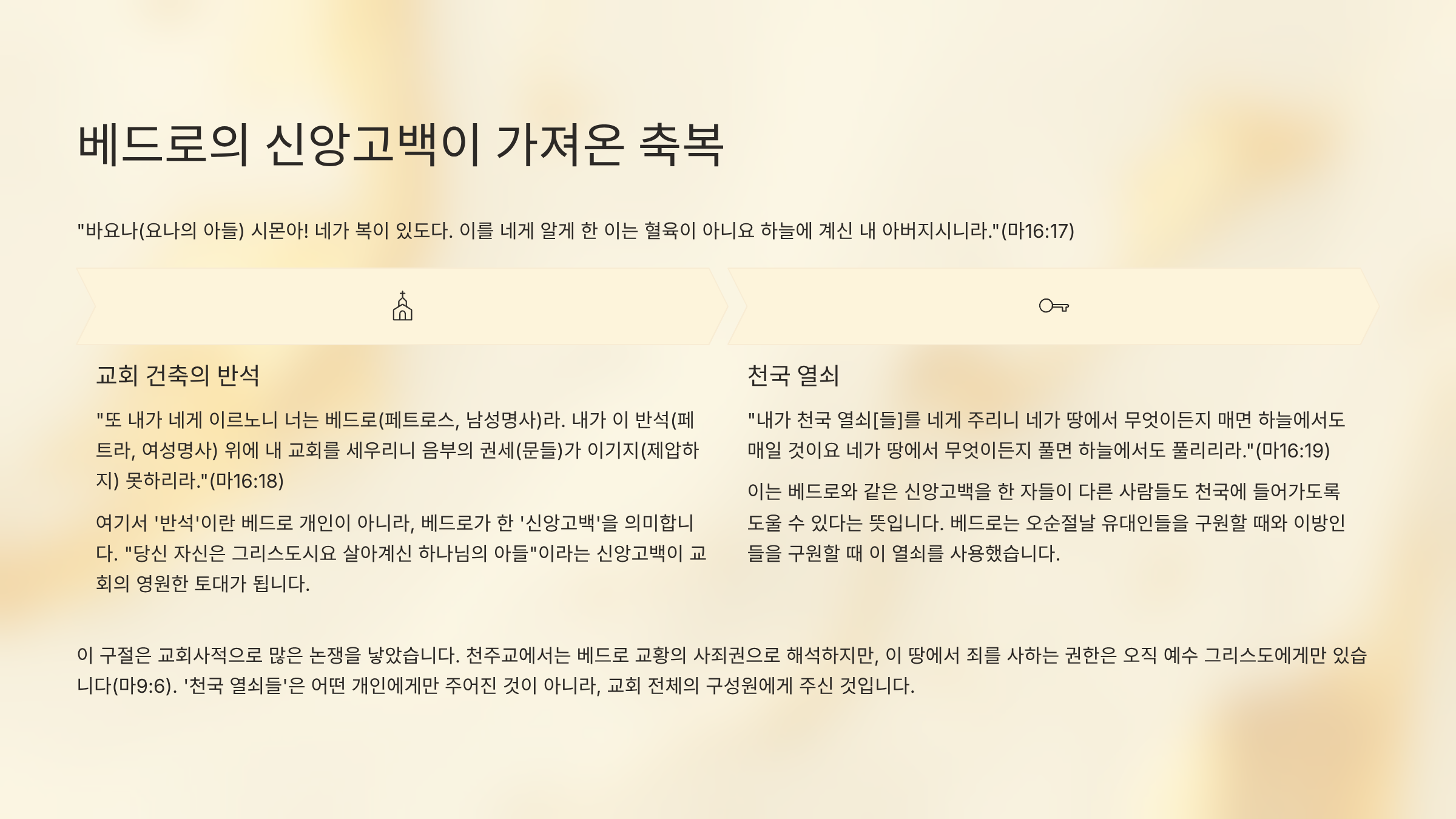 그런데 바로 이 구절이 교회사적으로 많은 논쟁을 낳는다. 왜냐하면 지금까지 천주교에서는 이 구절을 가지고 베드로 교황의 사죄권, 즉 교황이 죄를 사하는 권한을 가진 것으로 해석하고 있기 때문이다. 그러나 이 땅에서 죄를 사하는 권한은 오직 예수 그리스도에게만 있는 것이다(마9:6). 왜냐하면 예수께서 인류의 죄를 사하러 이 땅에 사람으로 오셔서 고난받으시고 십자가에서 죽으셨기 때문이다. 그러므로 이 구절은 어떤 개인의 사죄권을 의미하는 것이 아니다. 왜냐하면 베드로와 같은 신앙고백으로 산출할 수 있는 축복이 바로 '천국 열쇠들'이기 때문이다. 그러므로 '천국 열쇠들'은 어떤 개인에게만 주어진 것이 아니다. 교회 전체의 구성원에게 주신 것이다. 그것은 마태복음 18:18~19에서도 명확하게 나온다.