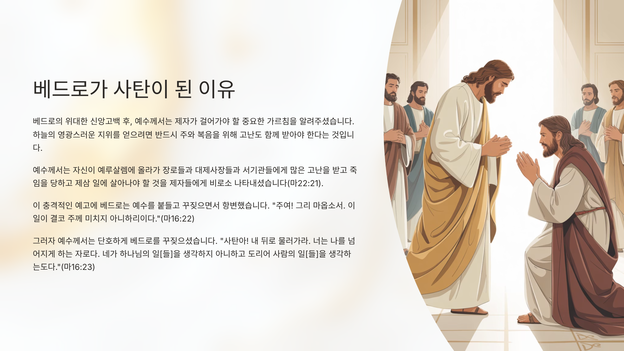 그때였다. 이 충격적인 예고의 말씀에 베드로는 예수를 붙들고 꾸짖으면서 항변하였다. "주여! 그리 마옵소서. 이 일이 결코 주께 미치지 아니하리이다."(마16:22) 이는 주님을 위하는 마음에서 비롯된 인간적 인 염려이지만, 그 이면에는 하나님의 뜻을 가로막으려는 사탄의 계략이 숨어있었다. 그러자 예수께서는 단호하게 베드로를 꾸짖으신다. "사탄아! 내 뒤로 물러가라. 너는 나를 넘어지게 하는 자로다. 네가 하나님의 일[들]을 생각하지 아니하고 도리어 사람의 일[들]을 생각하는도다."(마16:23) 그랬다. 방금 전만 해도 "복이 있도다" 칭찬받았던 베드로가 순식간에 "사탄"이라는 책망을 듣게 된 것이다. 이것은 우리에게 매우 중요한 교훈을 준다. 아무리 위대한 신앙고백을 했다 할지라도, 하나님의 뜻보다 자신의 생각과 계획을 앞세우는 순간, 누구든지 사탄의 도구로 전락할 수 있다는 것이다. 왜냐하면 참된 신앙이란 나의 뜻을 관철하는 것이 아니라, 나의 뜻을 꺾고 하나님의 뜻에 순종하는 것이기 때문이다.