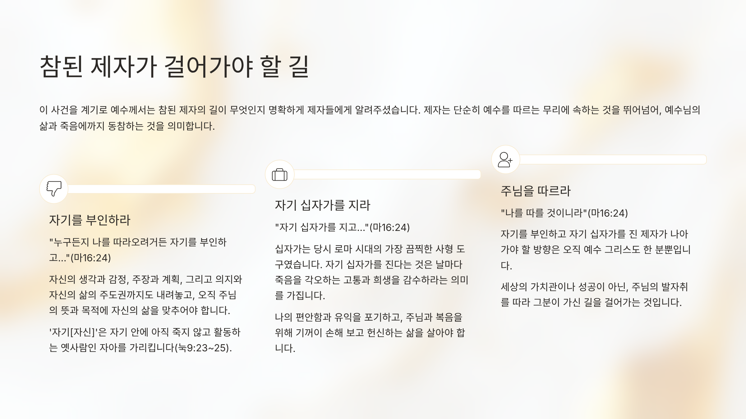 이 사건을 계기로 예수께서는 참된 제자의 길이 무엇인지 명확하게 제자들에게 알려준다. 이는 제자가 단순히 예수를 따르는 무리에 속하는 것을 뛰어넘는 것으로서, 예수님의 삶과 죽음에까지 동참하는 것을 의미하기 때문이다. 그렇다면 참된 제자가 걸어가야 할 세 가지 핵심적인 사항은 무엇인가?(마16:24)