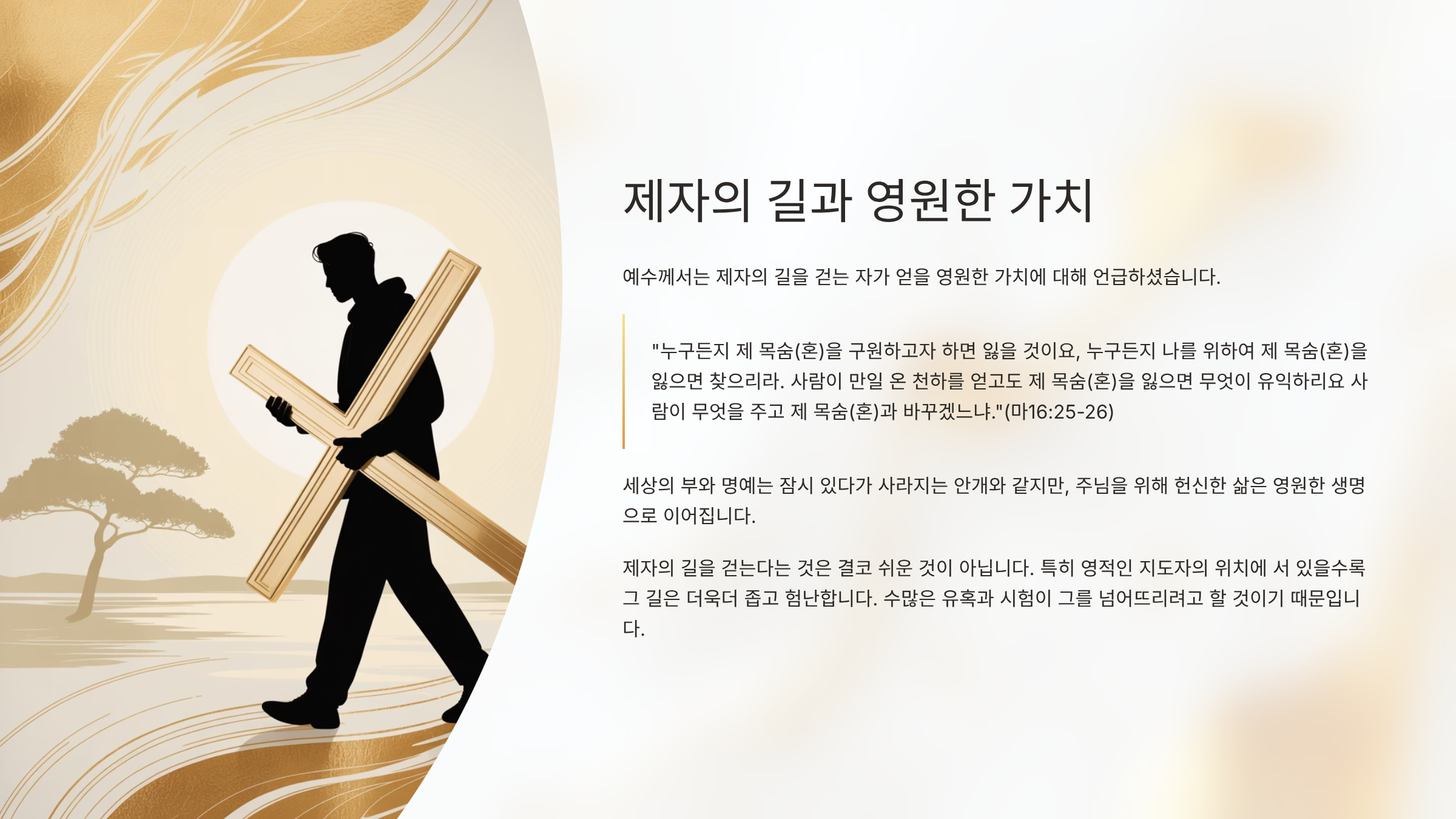 둘째, "날마다"(눅9:23) "자기의 십자가를 지라"는 것이다(마16:24). 십자가는 당시 로마 시대의 가장 끔찍한 사형 도구였다. 따라서 자기 십자가를 진다는 것은 날마다 죽음을 각오하는 고통과 희생을 감수하라는 의미를 가진다. 그리고 이것은 추상적인 상태를 가리키는 것이 아니다. 나의 편안함과 유익을 포기하고, 주님과 복음을 위해 기꺼이 손해 보고 헌신하는 삶을 살아야 함을 가리키기 때문이다. 그리고 이러한 십자가를 지는 삶을 단지 일회성 이벤트로 실천하는 것이 아니라, 매일, 매 순간 짊어져야 하는 것이다. 이것이 바로 참된 제자의 길이다.