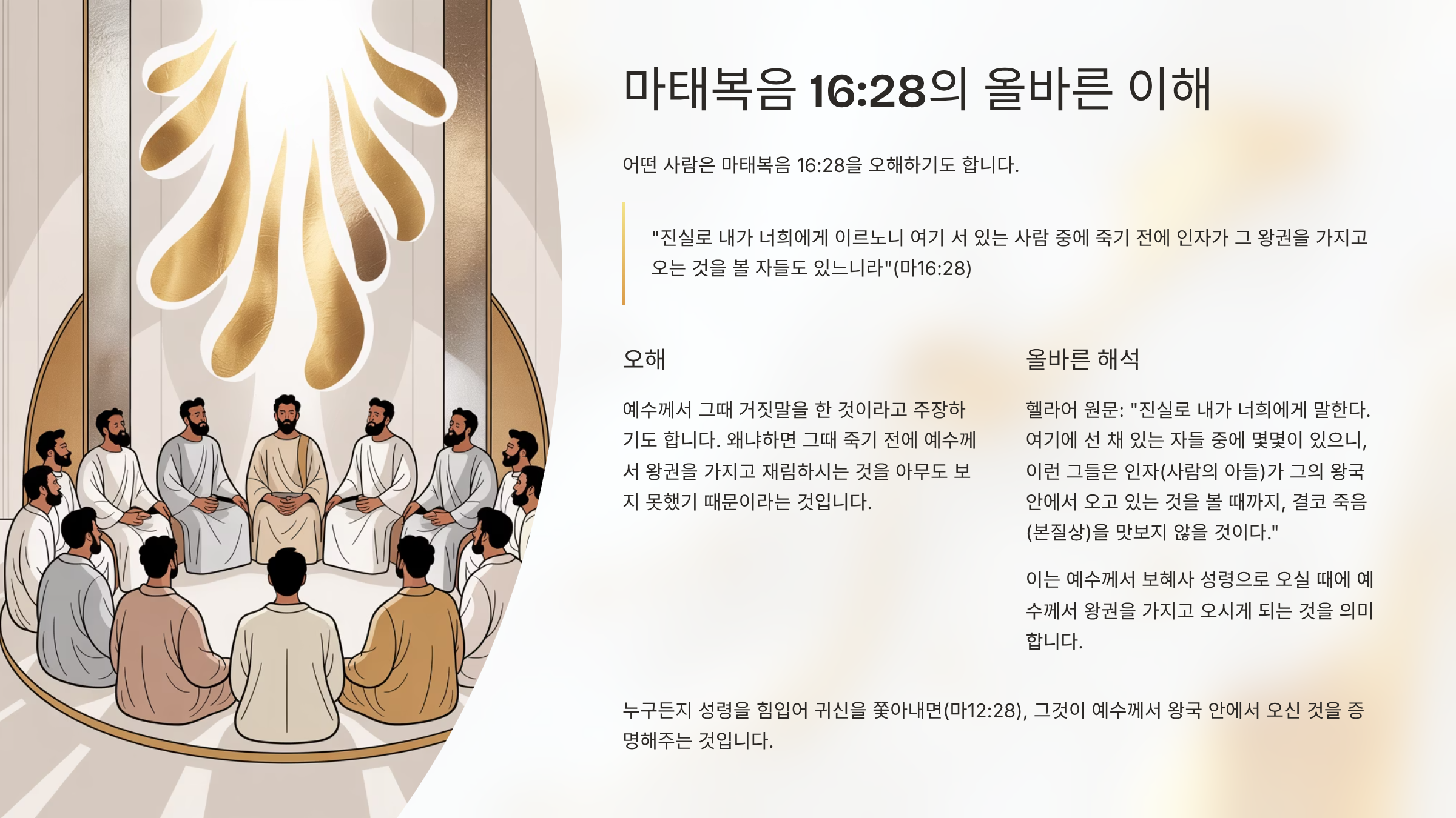 그런데 어떤 사람은 이  마지막 구절의 말씀을 오해하기도 한다. 즉 예수께서 그때 거기에 서 있는 사람들 중에 죽기 전에 인자가 왕국 안에서 오고 있는 것을 볼 자들도 있을 것이라는 말을 오해하여 예수께서 그때 거짓말을 한 것이라고 주장하기도 하는 것이다. 왜냐하면 그때 죽기 전에 예수께서 왕권을 가지고 재림하시는 것을 아무도 보지 못했기 때문이라는 것이다. 하지만 이 말씀은 예수님의 재림하실 때 그 일이 성취된다는 뜻이 아니다. 이 말씀을 헬라어 원문으로 보면, "진실로 내가 너희에게 말한다. 여기에 선 채 있는 자들 중에 몇몇이 있으니, 이런 그들은 인자(사람의 아들)가 그의 왕국 안에서 오고 있는 것을 볼 때까지, 결코 죽음(본질상)을 맛보지 않을 것이다.”(마16:28)라는 말씀이기 때문이다. 이는 예수께서 보혜사 성령으로 오실 때에 예수께서 왕권을 가지고 오시게 되는 것이며, 그렇게 되면 누구든지 성령을 힘입어 귀신을 쫓아 내고(마12:28), 그러면 그것이 예수께서 왕국 안에서 오신 것을 증명해주기 때문이다.