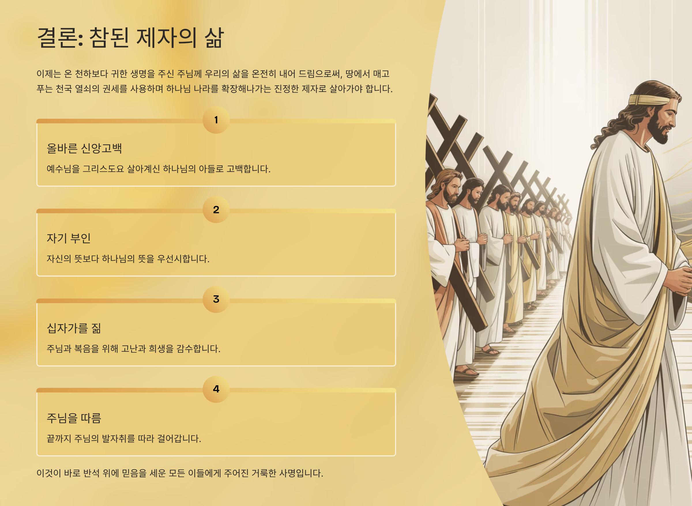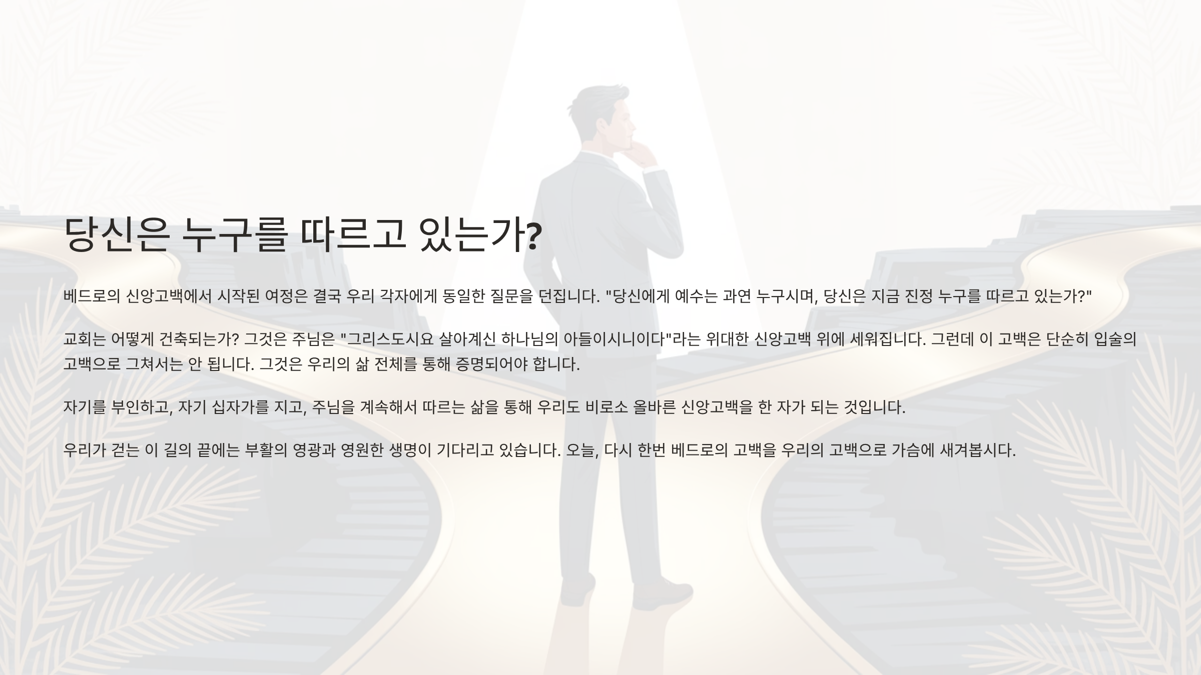 베드로의 신앙고백에서 시작된 여정은 결국 우리 각자에게 동일한 질문을 던지며 다가온다. "당신에게 예수는 과연 누구시며, 당신은 지금 진정 누구를 따르고 있는가?" 교회는 어떻게 건축되는가? 그것은 주님은 "그리스도시요 살아계신 하나님의 아들이시니이다"라는 위대한 신앙고백 위에 세워진다. 그런데 이 고백은 단순히 입술의 고백으로 그쳐서는 안 된다. 그것은 우리의 삶 전체를 통해 증명되어야 하는 것이다. 이때 자기를 부인하고, 자기 십자가를 지고, 주님을 계속해서 따르는 삶을 통해 우리도 비로소 올바른 신앙고백을 한 자가 되는 것이다. 그러므로 제자의 길을 걸어간다는 것은 결코 쉬운 것이 아니다. 특히 영적인 지도자의 위치에 서 있을수록 그 길은 더욱더 좁고 험난하다. 수많은 유혹과 시험이 그를 넘어뜨리려고 할 것이기 때문이다. 그러므로 우리는 기억해야 한다. 우리가 걷는 이 길의 끝에는 부활의 영광과 영원한 생명이 기다리고 있다는 사실을 말이다. 오늘, 다시 한번 베드로의 고백을 우리의 고백으로 가슴에 새겨보자. 그리고 우리의 삶이 그 고백을 살아내는 제자의 길 위에 굳건히 서 있기를 바란다. 이제는 온 천하보다 귀한 생명을 주신 주님께 우리의 삶을 온전히 내어 드림으로써, 땅에서 매고 푸는 천국 열쇠의 권세를 사용하며 하나님 나라를 확장해나가는 진정한 제자로 살아가야 한다. 이것이 바로 반석 위에 믿음을 세운 모든 이들에게 주어진 거룩한 사명이기 때문이다.