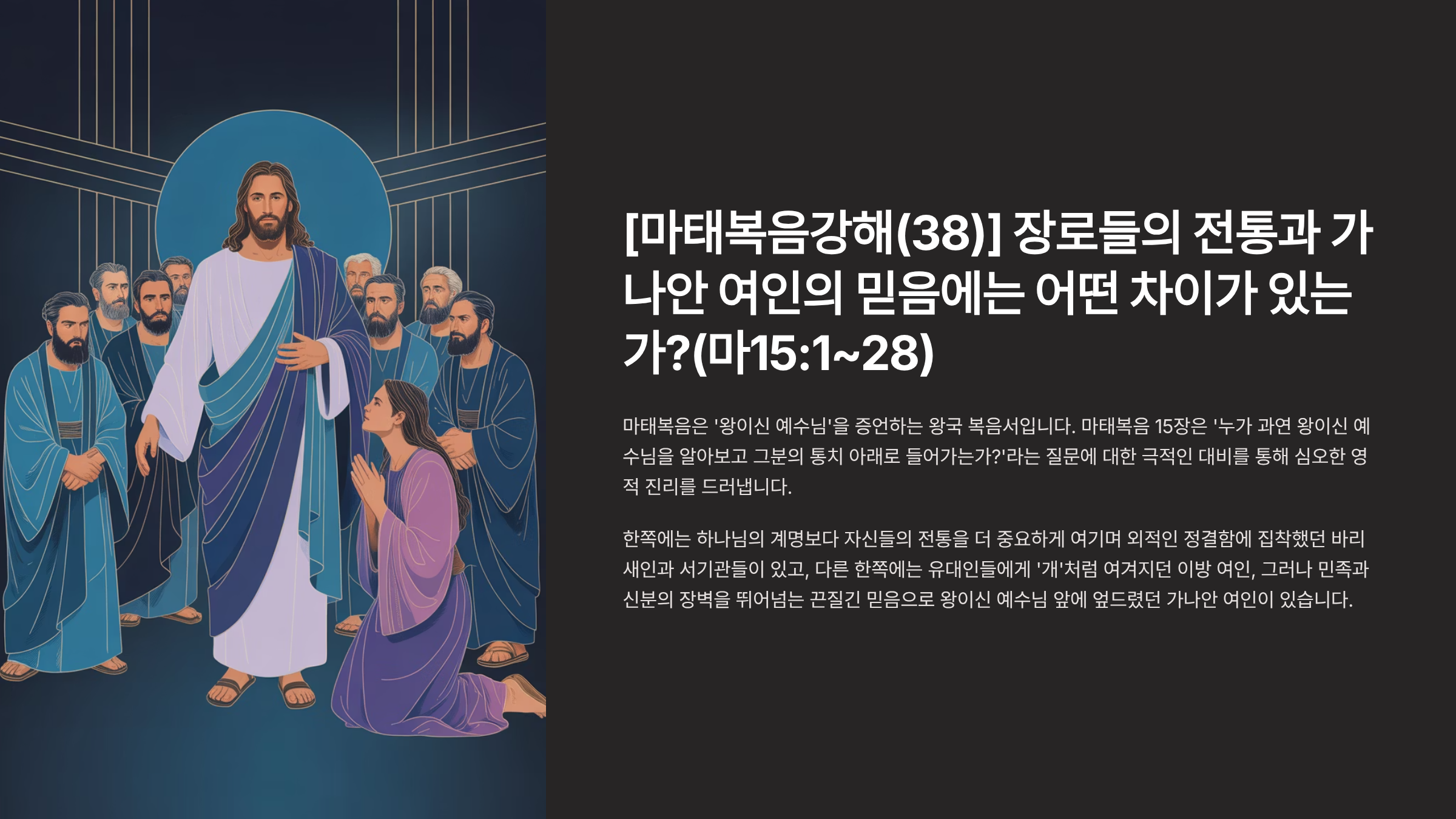마태복음은 ‘왕이신 예수님’을 증언하는 왕국 복음서이다. 따라서 마태복음의 모든 기록은 ‘누가 과연 왕이신 예수님을 알아보고 그분의 통치 아래로 들어가는가?’라는 질문을 중심으로 전개된다. 마태복음 15장은 이 질문에 대한 극적인 대비를 통해 심오한 영적 진리를 드러낸다. 한쪽에는 하나님의 계명보다 자신들의 전통을 더 중요하게 여기며 외적인 정결함에 집착했던 당대의 종교 지도자, 바리새인과 서기관들이 서 있다. 다른 한쪽에는 유대인들에게 ‘개’처럼 여겨지던 이방 여인, 그러나 민족과 신분의 장벽을 뛰어넘는 끈질긴 믿음으로 왕이신 예수님 앞에 엎드렸던 한 가나안 여인이 있다. 이 두 그룹의 극명한 대조를 통해, 마태는 무엇이 사람을 참으로 정결하게 하며, 누가 진정으로 하나님 나라에 합당한 자인지를 우리에게 묻고 있다. 따라서 이 시간에서는 마태복음 15장 1-28절에 나오는 두 사건을 깊이 있게 분석함으로써, 외식적인 종교의 한계와 참된 믿음의 본질이 무엇인지를 탐구하고자 한다.