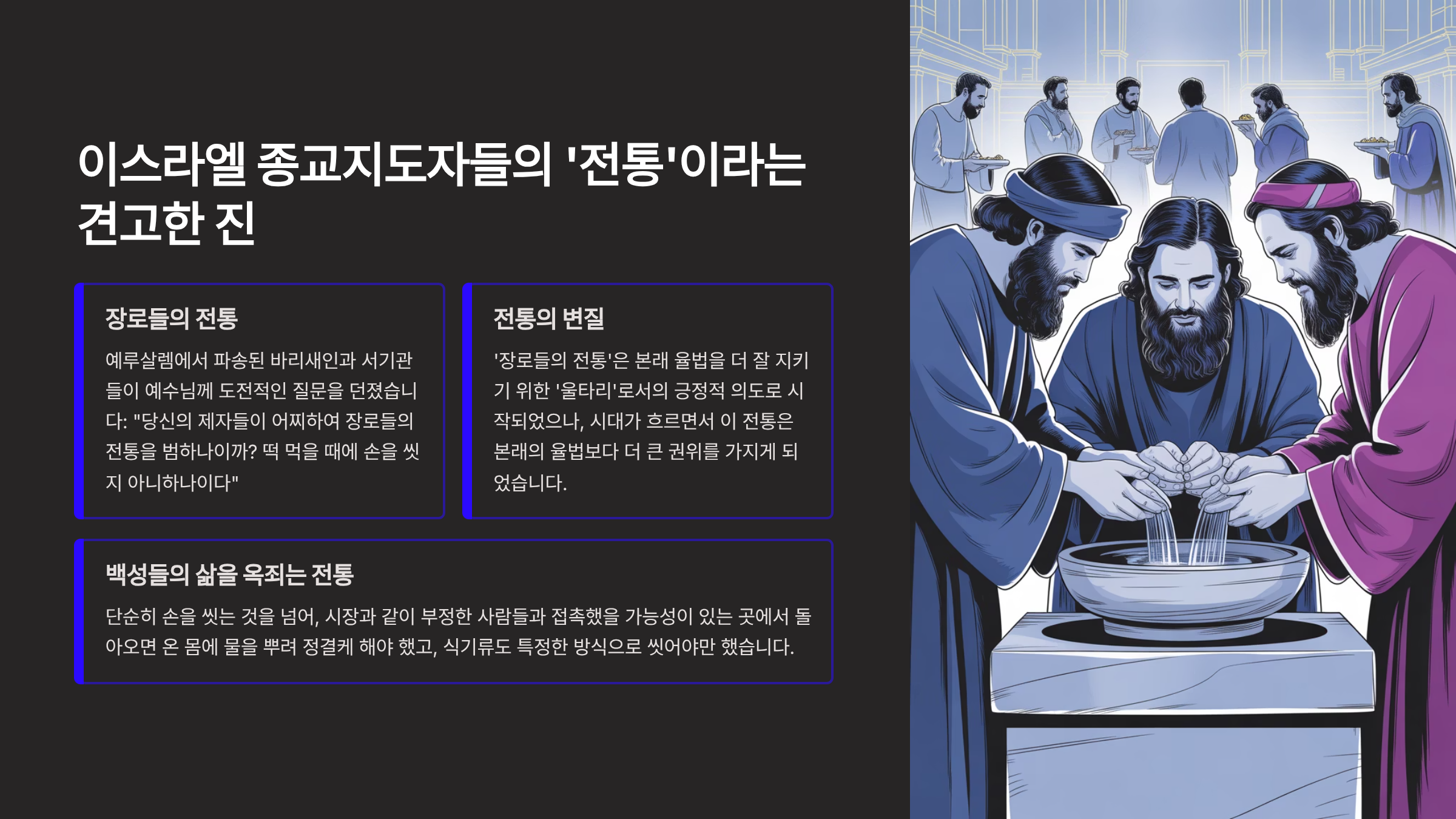 그런데 마가복음 7장에 나오는 평행본문은 이 전통이 얼마나 세세하고 백성들의 삶을 옥죄었는지를 구체적으로 보여주고 있다. 단순히 손을 씻는 것을 넘어, 시장과 같이 부정한 사람들과 접촉했을 가능성이 있는 곳에서 돌아오면 온 몸에 물을 뿌려 정결케 해야 했고, 손님을 접대하는 데 사용되는 잔과 주발과 놋그릇 같은 식기류도 특정한 방식으로 씻어야만 했기 때문이다. 이스라엘 백성에게 이러한 외적인 정결 규정의 준수 여부는 한 사람의 경건을 측정하는 가장 중요한 척도가 되고 있었다. 따라서 예수님의 제자들이 손을 씻지 않고 음식을 먹는 행위는, 그들 눈에 신성모독에 가까운 심각한 범죄로 비쳤던 것이다. 그러나 실제로 서기관과 바리새인들은 예수님의 제자들의 행위를 고발함으로 스승인 예수님의 권위와 가르침에 흠집을 내고자 시도하는 것이었다.