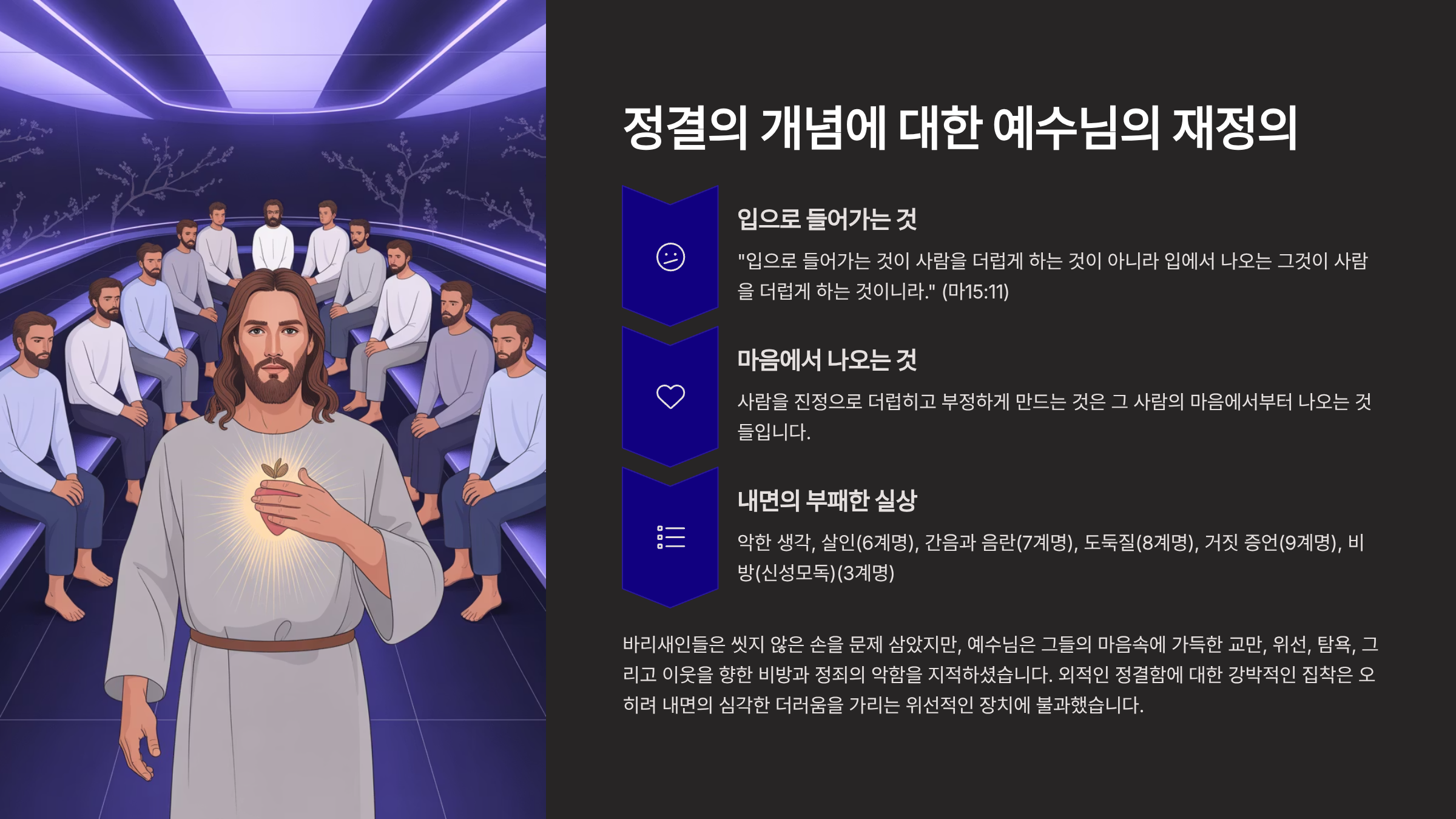 그때 예수께서는 이 논쟁을 통해 문제의 핵심, 즉 정결의 개념이 무엇인지를 근본적으로 다시 정의하셨다. 그분은 무리를 불러 모아 이렇게 말씀하셨다. “입으로 들어가는 것이 사람을 더럽게 하는 것이 아니라 입에서 나오는 그것이 사람을 더럽게 하는 것이니라.”(마15:11) 그런데 제자들조차 이 비유의 뜻을 깨닫지 못하자, 예수께서는 더욱 분명하게 설명하신다. 입으로 들어가는 음식은 배로 들어가 소화된 후 몸 밖으로 배설될 뿐, 영혼을 더럽힐 수는 없다. 그러나 사람을 진정으로 더럽히고 부정하게 만드는 것은, 바로 그 사람의 마음에서부터 나오는 것들이다. 그리고 그 목록은 악한 생각을 제외하고는 십계명을 어긴 죄들을 가리킨다. 곧 악한 생각, 살인(6계명), 간음과 음란(7계명), 도둑질(8계명), 거짓 증언(9계명), 비방(신성모독)(3계명). 그러므로 이러한 목록은 인간 내면의 부패한 실상을 적나라하게 드러내준다. 바리새인들은 씻지 않은 손을 문제 삼았지만, 예수님은 그들의 마음속에 가득한 교만, 위선, 탐욕, 그리고 이웃을 향한 비방과 정죄의 악함을 지적하신 것이다. 외적인 정결함에 대한 강박적인 집착은, 오히려 내면의 심각한 더러움을 가리는 위선적인 장치에 불과했던 것이다.