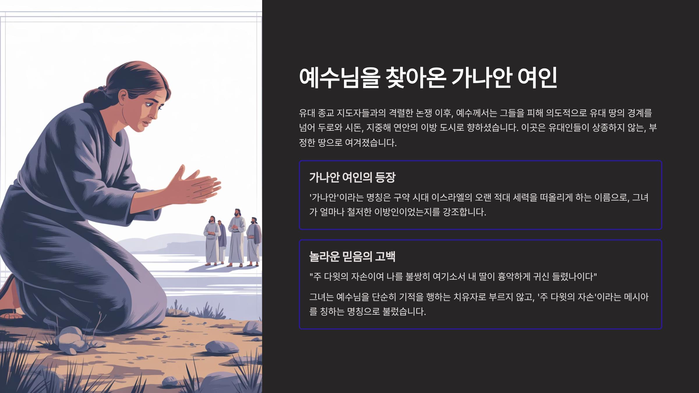 유대 종교 지도자들과의 격렬한 논쟁 이후, 예수께서는 그들을 피해 의도적으로 유대 땅의 경계를 넘으신다. 그분이 향하신 곳은 두로와 시돈, 지중해 연안의 이방 도시였다. 이곳은 유대인들이 상종하지 않는, 부정한 땅으로 여겨졌다. 그런데 바로 그때, 이러한 이방의 땅에서, 예수님의 사역의 새로운 지평을 여는 한 인물이 등장한다. 그녀는 ‘가나안 여인’으로 소개된다. ‘가나안’이라는 명칭은 구약 시대 이스라엘의 오랜 적대 세력을 떠올리게 하는 이름으로, 그녀가 얼마나 철저한 이방인이었는지를 강조한다.