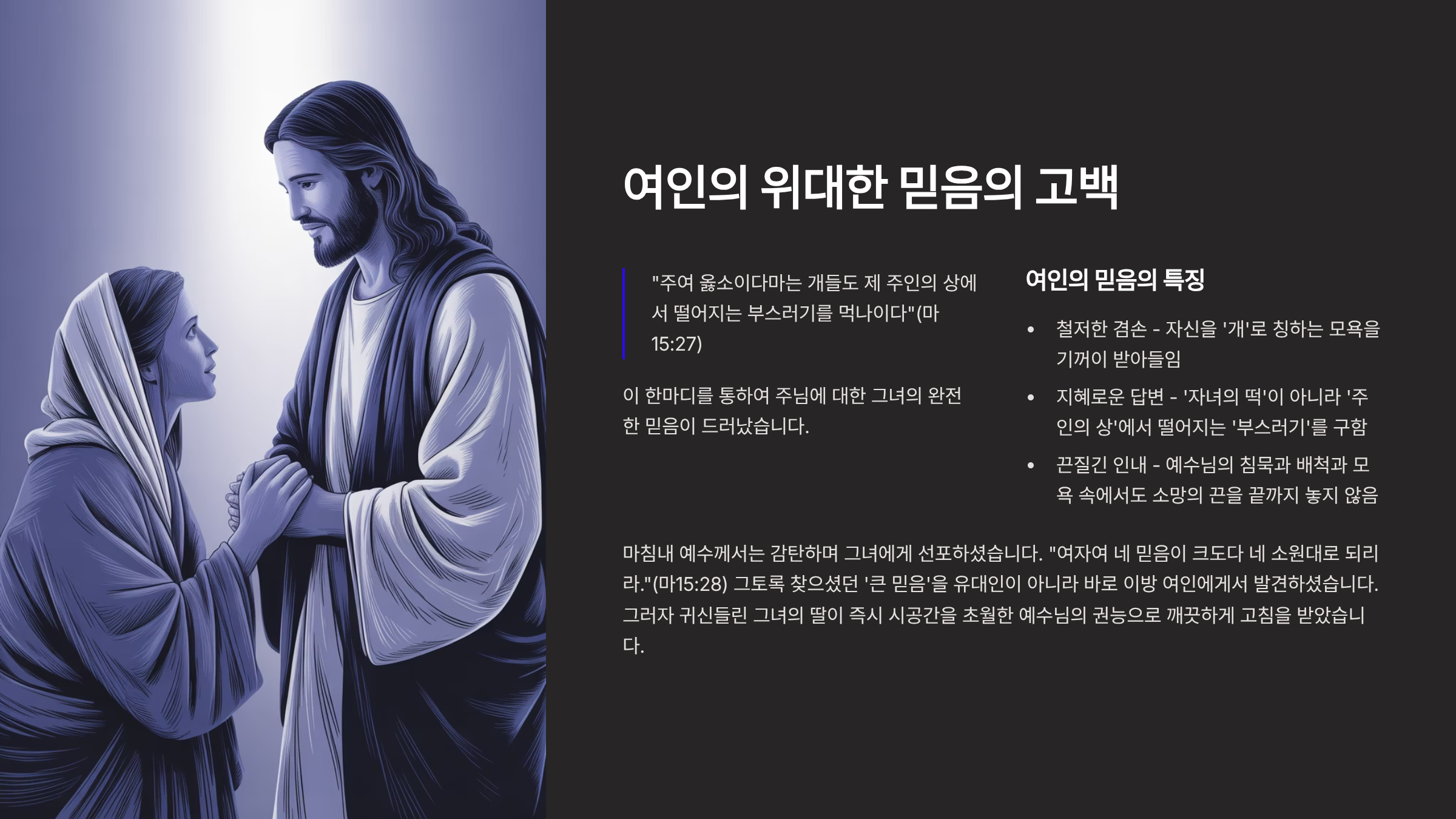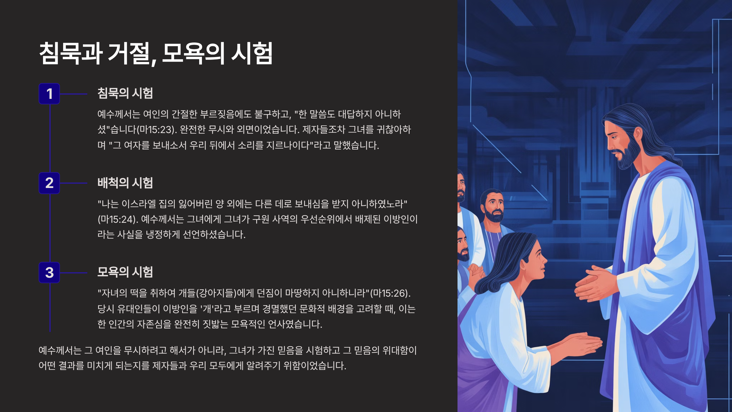 첫째, 예수께서는 '침묵'하셨다. 그 여인의 간절한 부르짖음에도 불구하고, 예수께서는 “한 말씀도 대답하지 아니하셨”기 때문이다(마15:23). 완전한 무시와 외면이었다. 제자들조차 그녀를 귀찮아하며 “그 여자를 보내소서 우리 뒤에서 소리를 지르나이다”라고 말할 정도였다. 그러나 여인은 결코 포기하지 않았다.