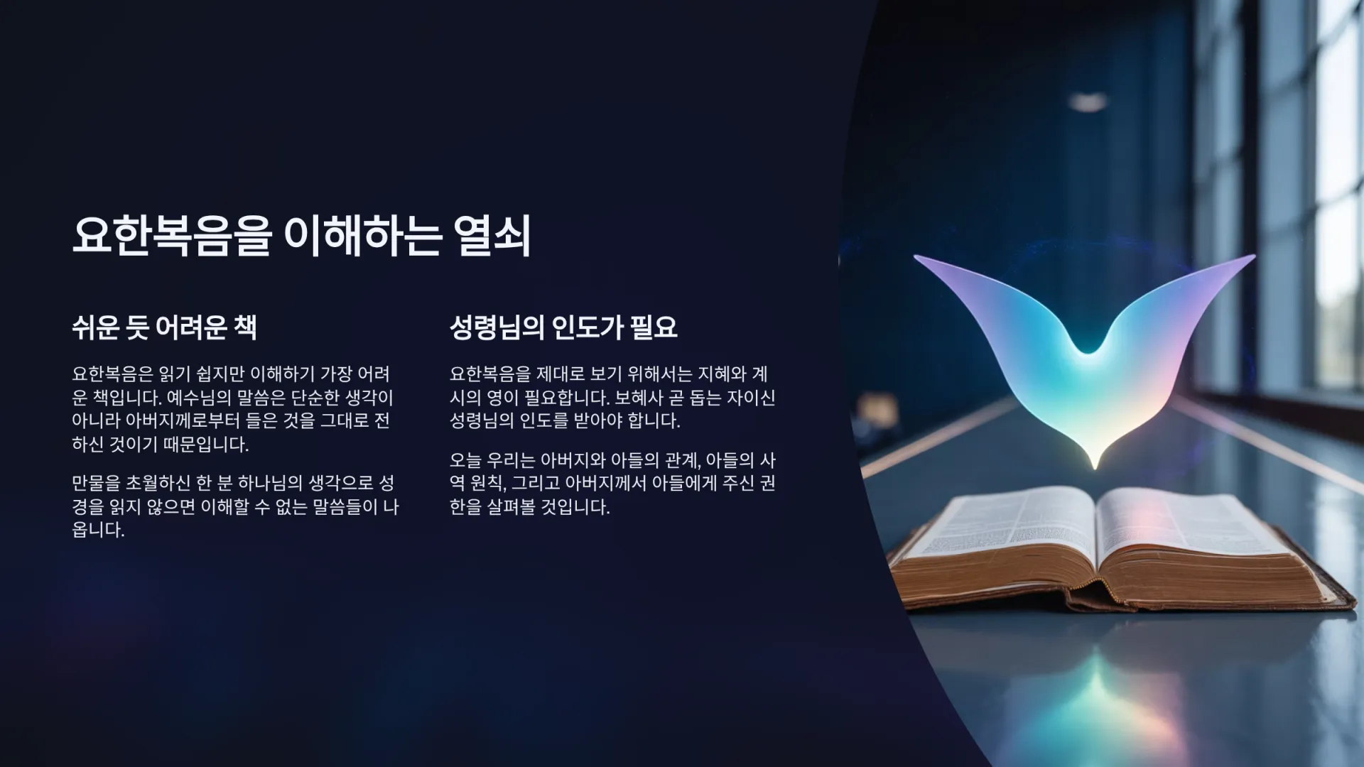 요한복음은 참으로 읽기가 쉬운 책이다. 그러나 그 내용을 이해하기가 가장 어려운 책이기도 하다. 요한복음은 다른 공관복음서에 비해 쉽게 쓰였지만 그 내용을 곰곰이 읽다 보면 우리가 이해하기 어려운 말씀들이 많이 들어 있기 때문이다. 특히 예수께서 하신 말씀들이 그렇다. 그 말씀들은 그냥 단순히 예수님의 생각에 떠오른 것을 들려주신 말씀이 아니기 때문이다. 그것은 아버지께로부터 들은 것을 그대로 말씀하신 것이기 때문이다. 그러므로 만물을 초월해 계시고, 한 분으로 계신 하나님의 생각으로 성경을 읽지 않으면 이해할 수 없는 말씀들도 나오는 것이다. 특히 오늘 우리가 함께 나누게 될 말씀들도 이러한 말씀 가운데 첫 번째 말씀에 해당한다. 예수께서는 사람들과의 대화 속에서 아버지와 아들이신 예수님과의 관계를 설명해 주셨다. 물론 군중이 알아듣기 쉽도록 바꾸고 바꾸어서 말씀하신 것이지만, 듣는 이들은 그 말씀이 무슨 말씀인지를 도무지 이해하지 못했다. 그러므로 요한복음을 제대로 보기 위해서는 지혜와 계시의 영이 필요한 것이다. 그렇다. 우리 믿는 이들에게는 보혜사 곧 돕는 자이신 성령님의 인도를 받아야 하는 것이다. 그러므로 오늘은 성령님에 의지하여 주님께서 직접 들려주신 말씀들을 들여다보고자 한다. 우리는 오늘 말씀을 통하여 아버지와 아들의 관계 가운데 아들의 사역의 원칙 그리고 아버지께서 아들에게 주신 2가지 권한이 무엇인지를 살펴볼 것이다(요5:19~29). 그리고 왜 예수님의 말씀들은 믿을 만한 것인지에 대하여서도 4가지 증거를 통해 살펴볼 것이다(요5:30~40). 그리고 마지막으로 아들을 배척하는 유대인들에 대한 예수님의 탄식에 대해서도 살펴볼 것이다(요5:41~47). 이것을 통해 우리는 하나님의 아들이자 사람의 아들이신 예수님의 실체에 대해 보다 더 주님 가까이 가 보자.