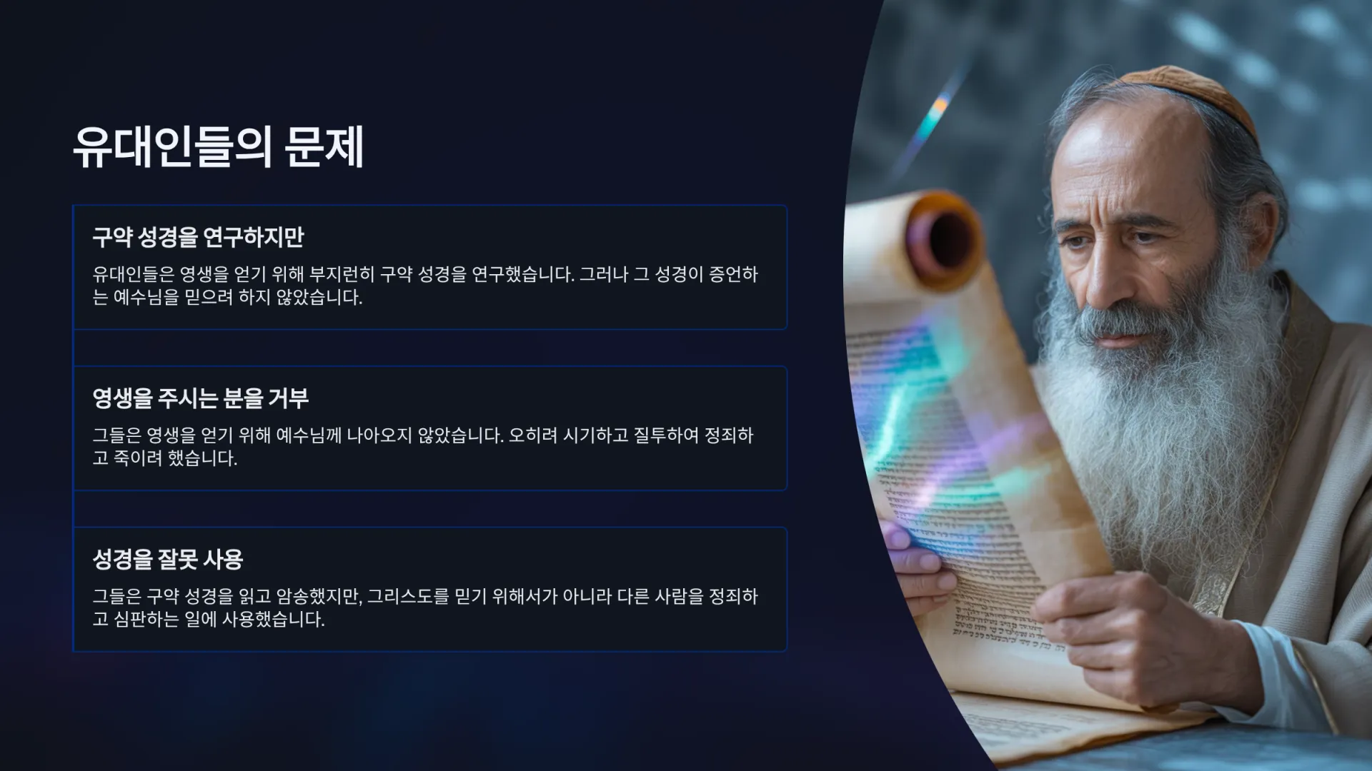 예수께서는 이제 안식일에 행하신 병자 치유를 빌미로 예수님을 시기 질투하고 정죄하는 유대인들을 향하여 예수님과 모세의 차이를 말씀해 주셨다. 예수께서 그들에게 나타나신 이유는 그들을 정죄하고 심판하기 위해서 오신 것이 아니라 오히려 구원하여 그들에게 안식을 주려고 오셨다고 하셨다. 하지만 그들이 지금까지 그토록 믿고 추앙하고 따르고 있는 모세는 장차 심판 때에 그들을 정죄하고 고발할 것이라고 하셨다(요5:45). 그리고 그들이 진정 모세의 글들 곧 모세 오경을 믿었다고 한다면 모세 오경이 증거하고 있는 바 그리스도이신 예수님을 믿었을 것이라고 말씀하셨다. 그러므로 그들이 예수님을 믿지 않는 것은 그들이 모세 오경을 믿지 않는 증거라고 하셨다. 비록 그들이 모세 오경을 귀하게 여기고 있지만, 그것을 통해 자신의 죄를 발견하고 구원자이신 그리스도를 붙잡기 위해 모세 오경을 보고 있었던 것이 아니라, 그것으로 남을 정죄하고 재판하기 위해 그렇게 하고 있었던 것이다.