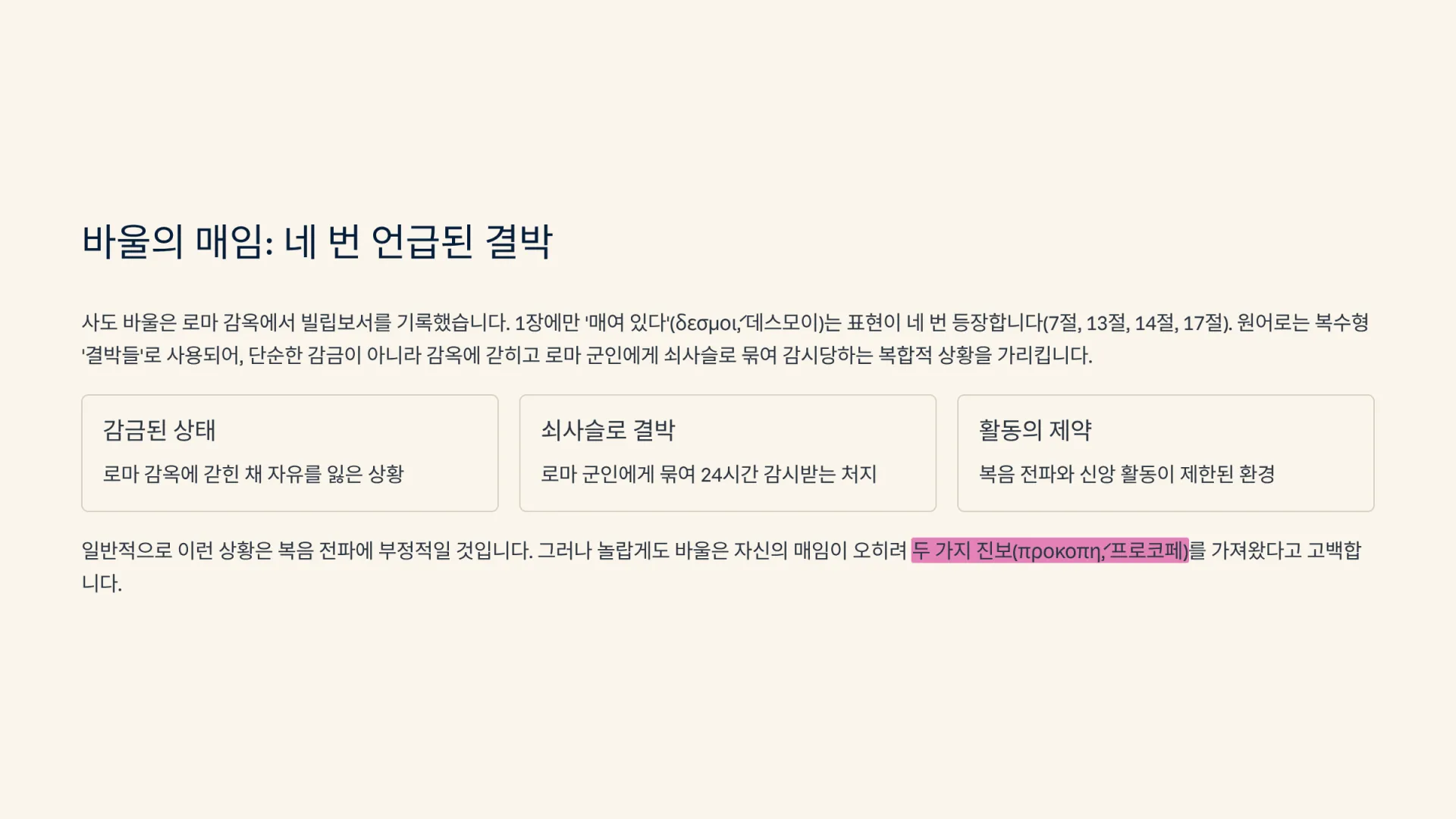 빌립보서는 사도 바울이 로마 감옥에 갇힌 상태, 즉 감금된 상태에서 기록한 옥중서신 중 하나이다. 빌립보서 1장에는 바울 자신이 ‘매여 있다’(δεσμοί, 데스모이), 즉 ‘결박된 상태에 있다’는 표현이 네 번이나 등장한다(7절, 13절, 14절, 17절). 원어로는 복수형(‘결박들’)으로 사용되었는데, 이는 단순한 감금이 아니라 여러 형태의 묶임, 예를 들어 감옥에 갇히는 것과 로마 군인에게 쇠사슬로 묶여 감시당하는 것 모두를 포함하는 상황이었음을 가리킨다.