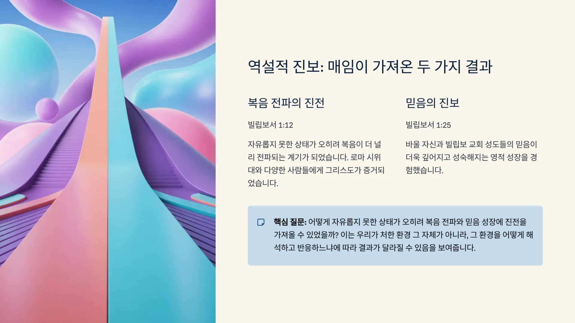 어떻게 자유롭지 못한 상태가 오히려 복음 전파와 믿음 성장에 진전을 가져올 수 있었을까? 이는 우리가 처한 환경이나 조건 그 자체가 아니라, 그 환경을 어떻게 해석하고 반응하느냐에 따라 결과가 달라질 수 있음을 보여준다. 바울은 자신의 고난을 좌절이나 원망의 이유로 삼지 않고, 오히려 하나님의 섭리 안에서 복음을 전파하고 믿음을 성장시키는 기회로 삼았기 때문이다.