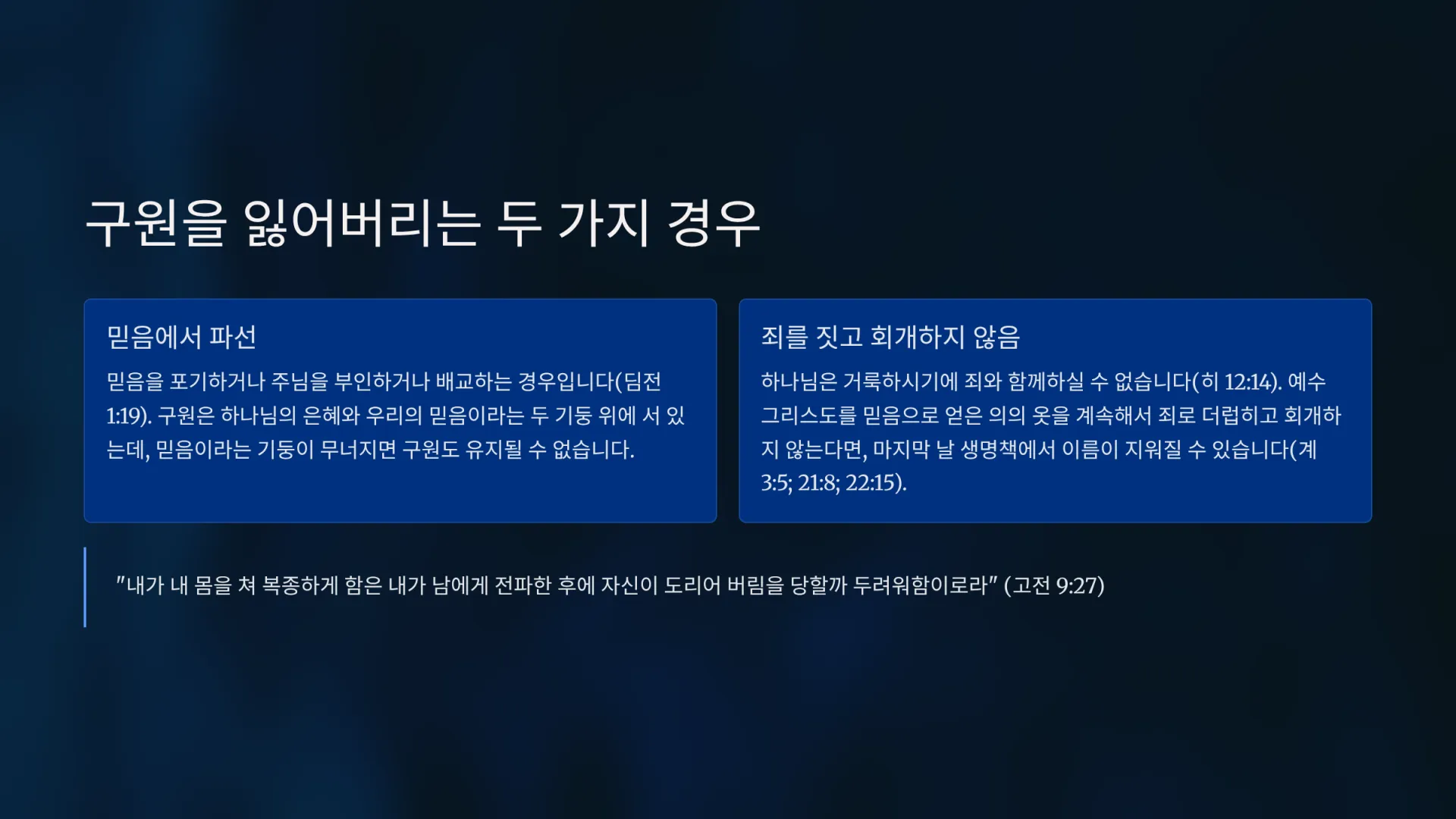 그럼, 구원을 잃어버리는 경우는 언제인가? 크게 두 가지 경우이다. 첫째는 믿음에서 파선하는 경우이다. 믿음을 포기하거나, 주님을 부인하거나, 배교하는 경우이다(딤전 1:19). 우리의 구원은 하나님의 은혜와 우리의 믿음이라는 두 기둥 위에 서 있는데, 믿음이라는 기둥이 무너지면 구원도 유지될 수 없다. 둘째는 죄를 짓고 회개하지 않는 경우이다. 하나님은 거룩하시기에 죄와 함께하실 수 없다(히 12:14). 예수 그리스도를 믿음으로 얻은 의의 옷을 계속해서 죄로 더럽히고 회개하지 않는다면, 마지막 날 하나님 나라에 합당하지 않은 자로 판명되어 생명책에서 이름이 지워지고 성 밖으로 쫓겨나거나 불못에 던져질 수도 있다(계 3:5; 21:8; 22:15).