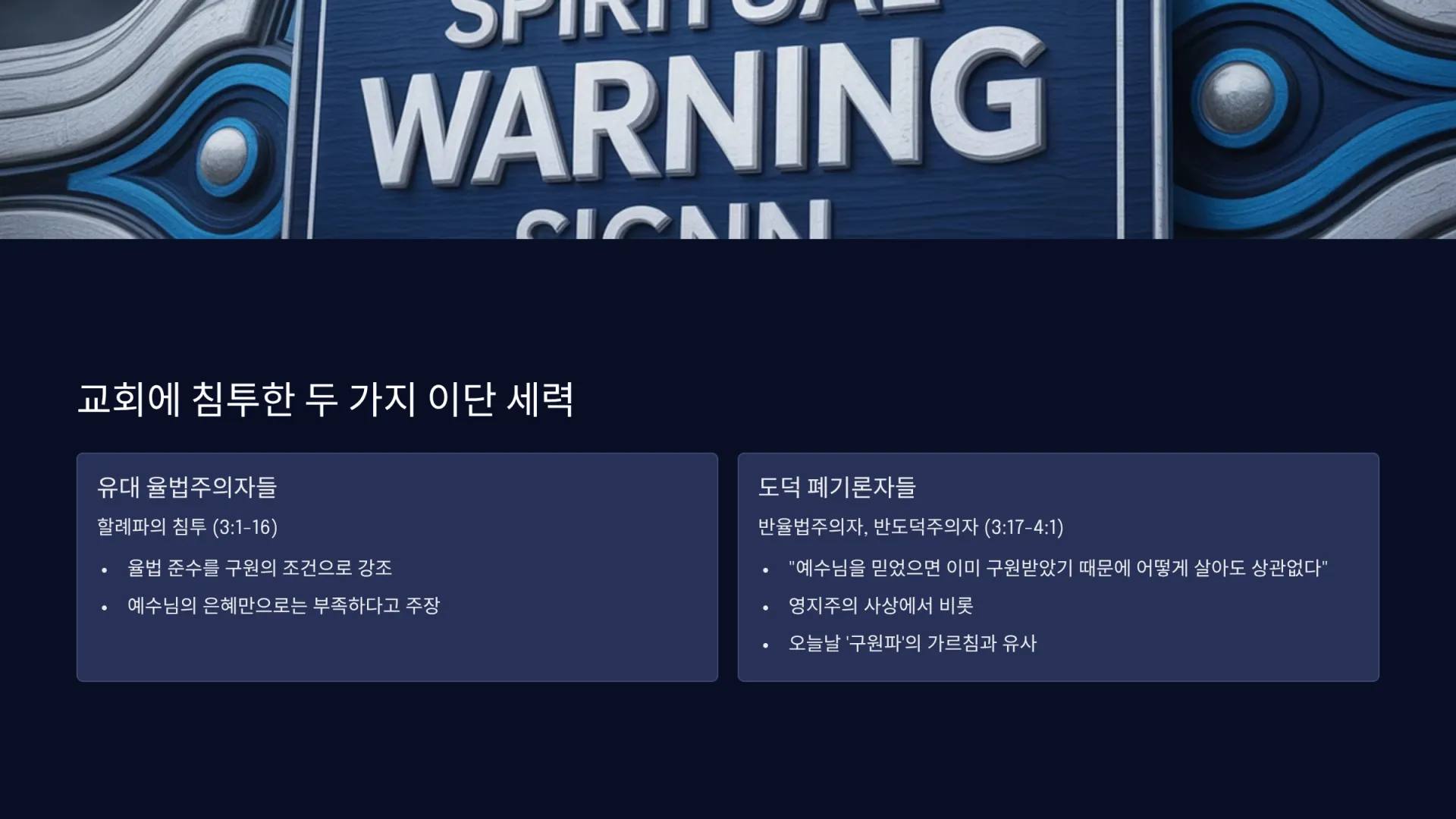 첫째, 유대 율법주의자들(할례파)의 침투이다 (3:1-16). 그리고 둘째, 도덕 폐기론자들(반율법주의자, 반도덕주의자)의 침투이다 (3:17-4:1). 이번 말씀은 이것들 중에 두 번째 문제, 즉 도덕 폐기론자들에 대해 다루고자 한다. 이들은 "예수님을 믿었으면 이미 구원받았기 때문에 어떻게 살아도 상관없다"고 가르쳤다. 이는 영지주의(Gnosticism) 사상에서 비롯된 것으로, 오늘날 ‘구원파’의 가르침과 매우 유사하다. 그들은 '예수 믿으면 과거, 현재, 미래의 죄까지 다 용서받았다'는 거짓말로 사람들을 미혹한다. 성경에는 그런 가르침이 없음에도 불구하고, 사람들은 그 말을 믿고 자신의 구원은 이미 따 놓은 당상처럼 생각하며 방종한 삶을 살게 되는 것이다.