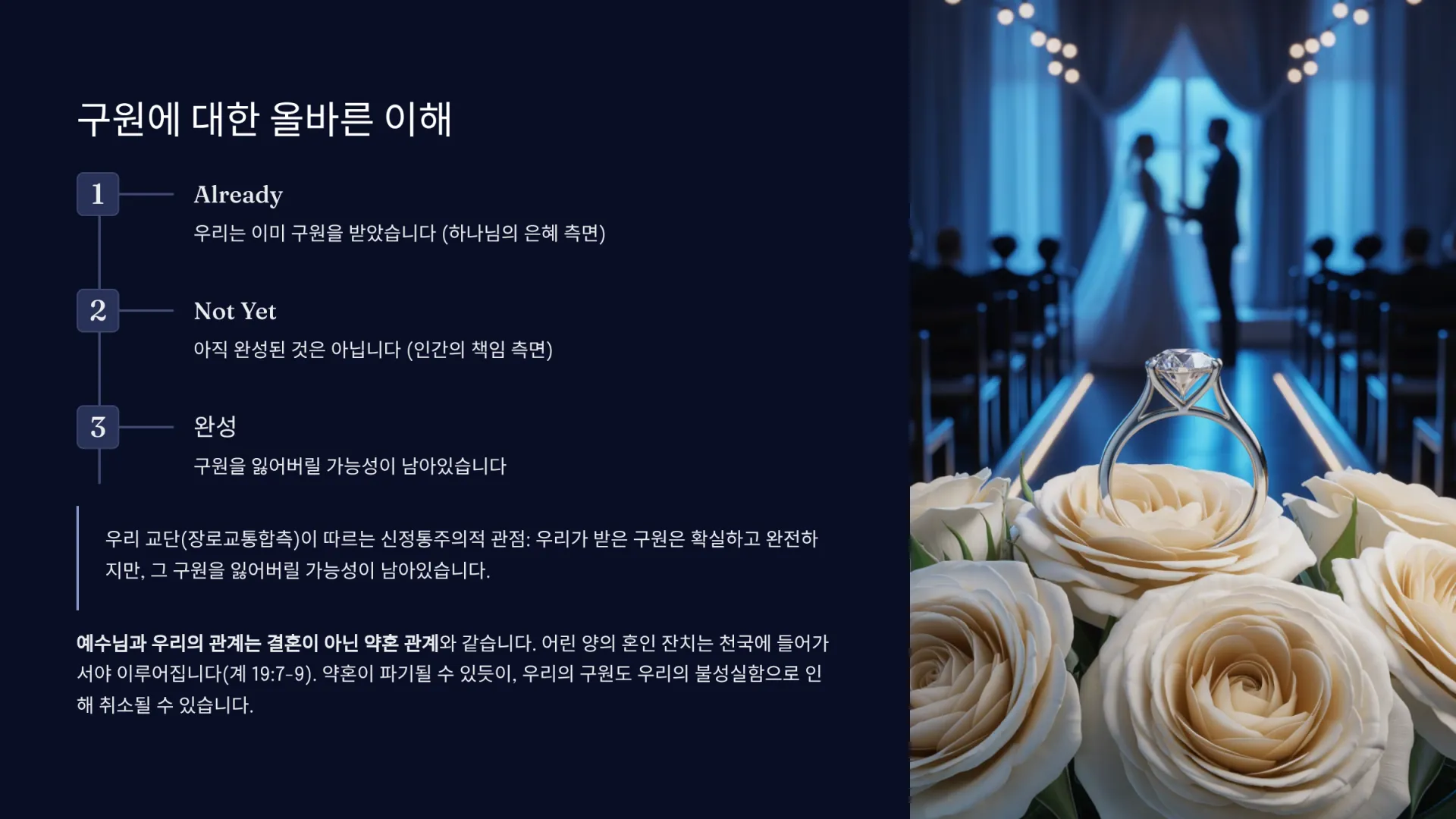 그러나 성경은 분명히 구원받은 성도라도 구원에서 탈락할 수 있음을 경고한다. 우리는 이미 구원을 받았지만('already'), 아직 완성된 것은 아니기 때문이다('not yet'). 이는 우리 교단(장로교통합측)이 따르는 신정통주의적 관점이기도 하다. 우리가 받은 구원은 확실하고 완전하지만(하나님의 은혜 측면), 그 구원을 잃어버릴 가능성(인간의 책임 측면)이 남아있는 것이다.