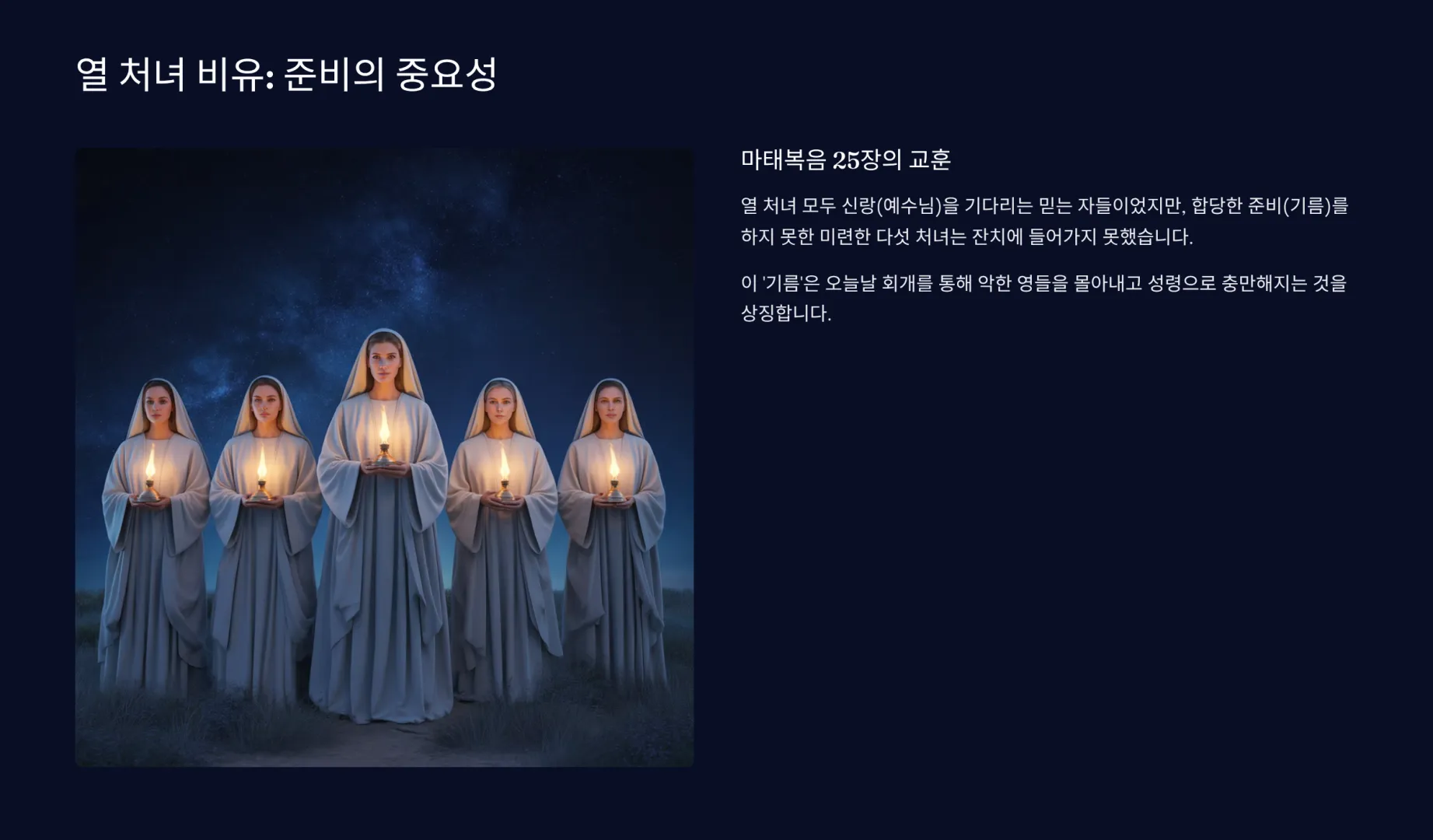 사실 예수님과 우리 성도들의 관계는 결혼이 아닌 약혼 관계와 같다. 어린 양의 혼인 잔치는 천국에 들어가서야 이루어진다(계 19:7-9). 약혼이 파기될 수 있듯이, 우리의 구원도 우리의 불성실함으로 인해 취소될 수 있다. 마태복음 25장의 열 처녀 비유는 이것을 잘 보여준다. 열 처녀 모두 신랑(예수님)을 기다리는 믿는 자들이었지만, 합당한 준비(기름)를 하지 못한 미련한 다섯 처녀는 잔치에 들어가지 못했다. 이 ‘기름’은 오늘날 회개를 통해 악한 영들을 몰아내고 성령으로 충만해지는 것을 상징한다. 그러므로 이번 시간에는 천국 시민권자(빌 3:20)로서, 이 땅에서 어떻게 살아야 과연 마지막 날 주님 앞에 섰을 때 그분의 기쁨이자 면류관(빌 4:1)이 될 수 있는지 살펴보고자 한다.