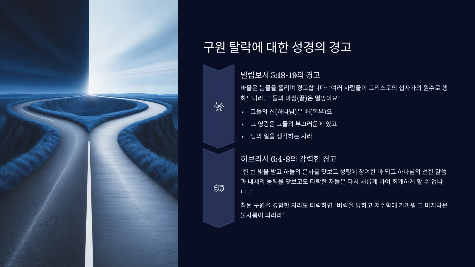 오늘날 많은 이들이 ‘한 번 구원은 영원하다’는 교리에 안주하여, 구원받은 성도는 결코 멸망하지 않는다고 주장한다. 그러나 성경은 그렇지 않다고 분명히 경고한다. 먼저 빌립보서에 나타난 바울의 경고부터 들어보자.
