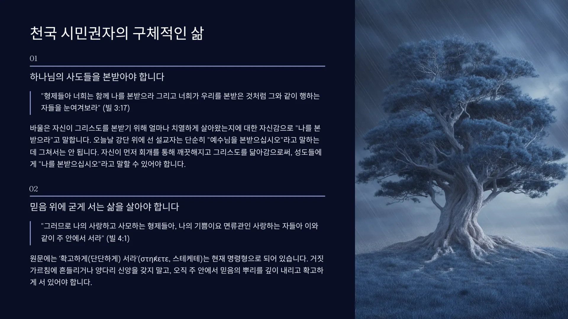 고로 성도는 이 두 가지 자세, 즉 바른 지도자를 본받는 삶주 안에서 흔들리지 않고 굳게 서는 삶을 살아냄으로 천국 시민권자로서 구원을 완성해 가야 한다.