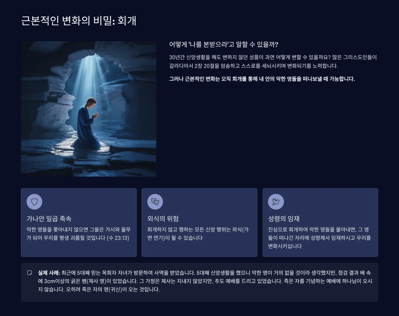 근본적인 변화는 오직 회개를 통해 내 안의 악한 영들이 떠나보낼 때 가능하다. 우리가 여호수아 강해에서 살펴 보았듯이, 가나안 일곱 족속(악한 영들)을 쫓아내지 않으면 그들은 가시와 올무가 되어 우리를 평생 괴롭힐 것이다(수 23:13). 필자 역시 수년간 회개 기도문을 통해 수많은 악한 영을 쫓아내면서 비로소 이 비밀을 깨달았다. 회개하지 않고 행하는 모든 신앙 행위는 외식(가면 연기)이 될 수 있다는 사실을 말이다. 그러나 진심으로 회개하여 악한 영들을 몰아내면, 그 영들이 떠나간 자리에 성령께서 임재하시고 우리를 변화시키신다. 회개해야 순수한 열정, 거룩한 열망, 그리스도를 얻고자 하는 기쁨이 샘솟는다.