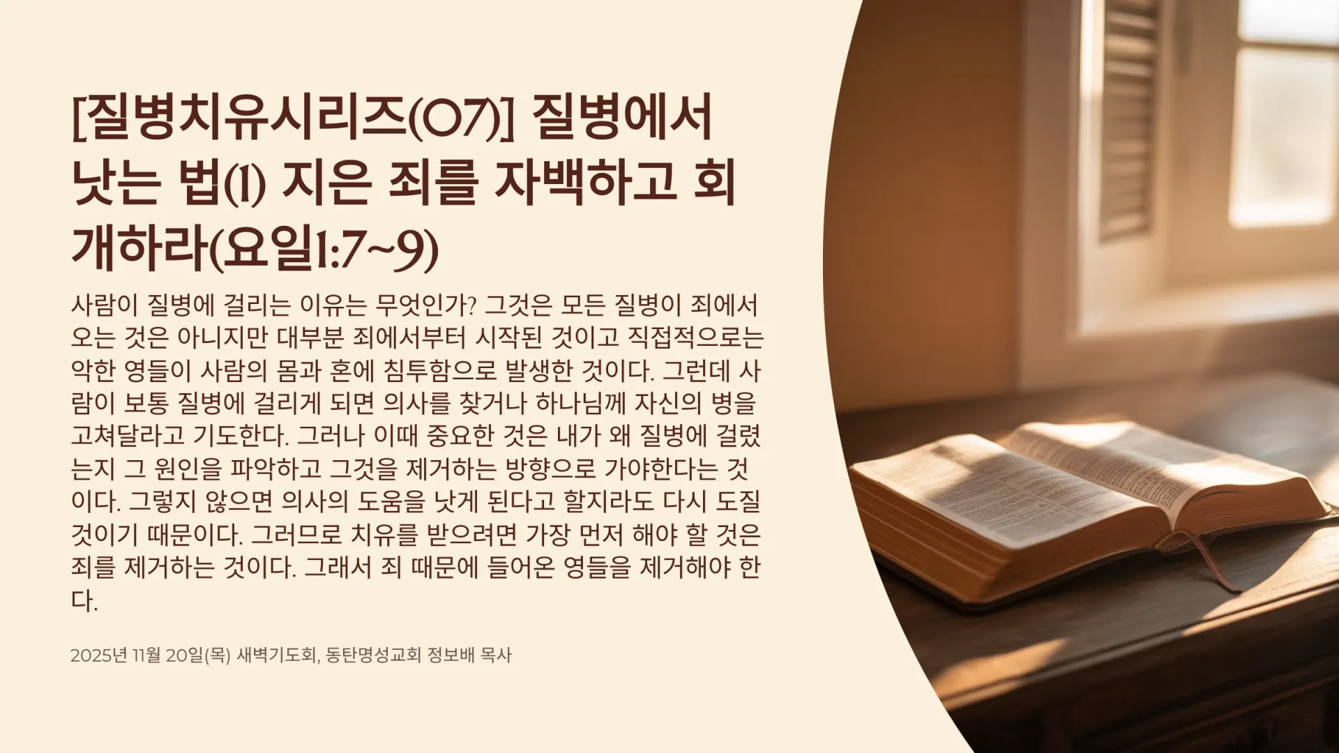 [질병치유시리즈(07)] 질병에서 낫는 법(1) 지은 죄를 자백하고 회개하라(요일1:7~9)_2025-11-20(목)