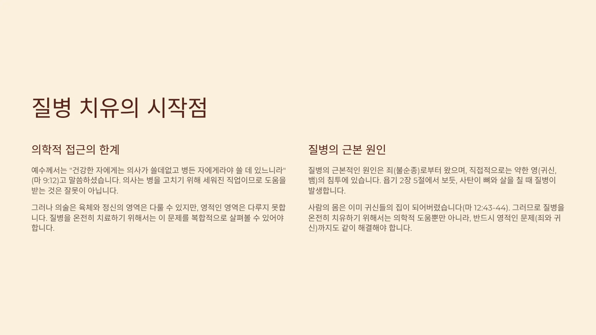 우리는 지난 시간들을 통해 질병의 근본적인 원인이 죄(불순종)로부터 온 것이며, 직접적으로 약한 영(귀신, 뱀)의 침투에 있었다는 사실을 살펴보았다. 욥기 2장 5절에서 보듯, 사탄이 뼈와 살을 칠 때 질병이 발생한다. 그러므로 사람의 몸은 이미 귀신들의 집이 되어버렸다(마 12:43-44). 그러므로 질병을 온전히 치유하기 위해서는 의학적 도움뿐만 아니라, 반드시 영적인 문제(죄와 귀신)까지도 같이 해결해야 한다.